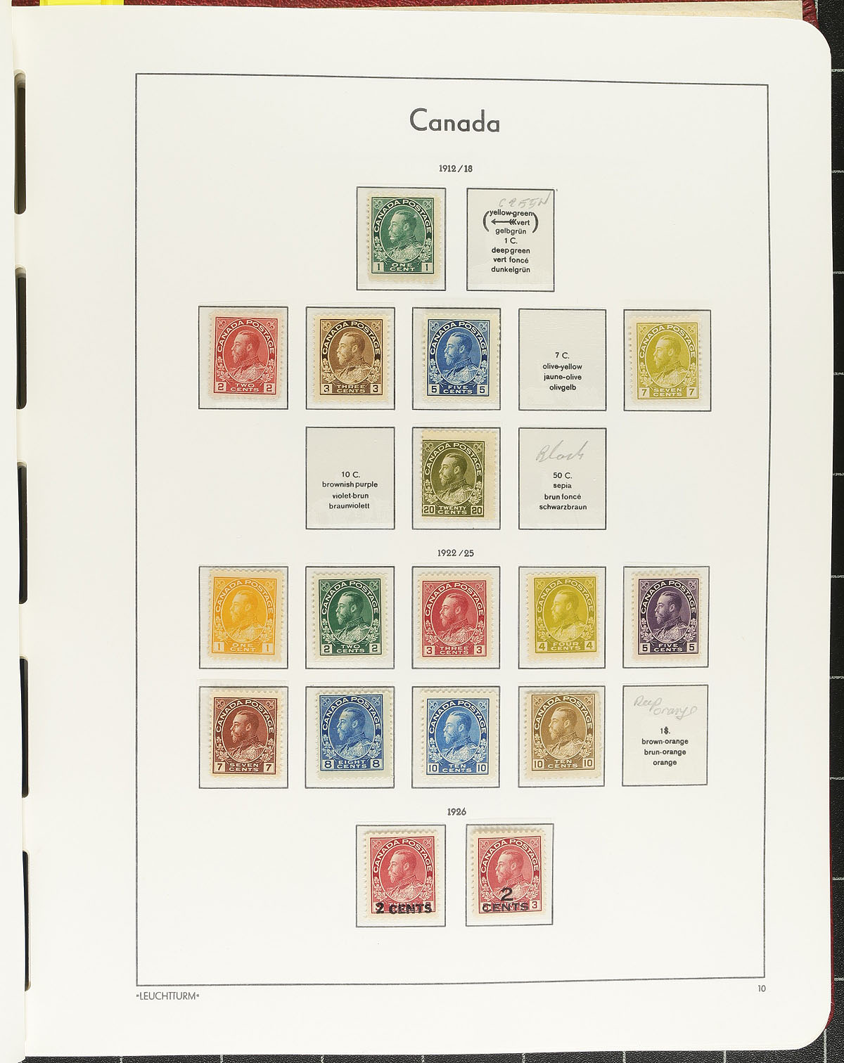 LIGHTHOUSE HINGELESS ALBUM COLLECTION. Primarily mint (hinged and never hinged) collection of Canada in a single red Lighthouse hingeless album with pages for 1851-1975 plus "back of the book". The collection itself ranges from 1870 to 1975, roughly 90-95% complete in period, and includes coil singles and "back of the book" material. The collection begins a 3c Small Queen, then partial set of the Leafs / Numerals, Edwards, Tercentenary, Admirals etc, Expect the earlier to be hinged, eventually transitioning to Never Hinged material in the late George VI/QEII era. Consignor's 2025 total Scott catalogue value totals US$9,238.95 ($12,272.00 CDN)! We note a few faults with the early material, along with some mint stamps having no gum, heavy hinging, or other faults up to the Admiral issues. Still a nice collection with much useful material perfect to build upon, integrate into your own collection or break apart. Well worth our conservative estimate. Estimate =