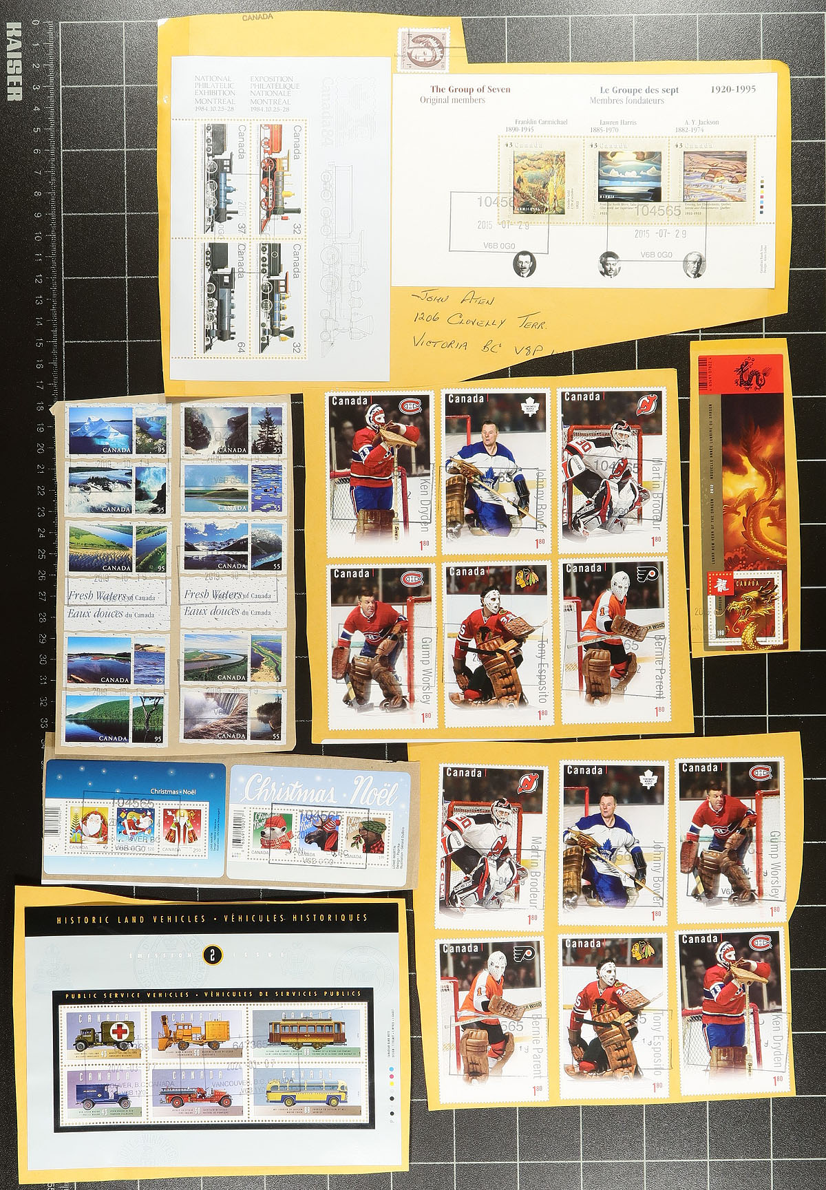 Marvelous Mostly Modern Used. A wonderful selection of "on-paper" mostly modern used Canada, carefully cut from parcels and packages received by collector over the years. Includes "Hockey Card Stamps" x12, $10.00 Whale complete pane and then 64x souvenir sheets including 2022 CAPEX souvenir sheet, BC Ferries, "Far and Wide", UNESCO, Nelson Mandela, 2012 QEII Jubilee, plus others. Tough to find material! Estimate =