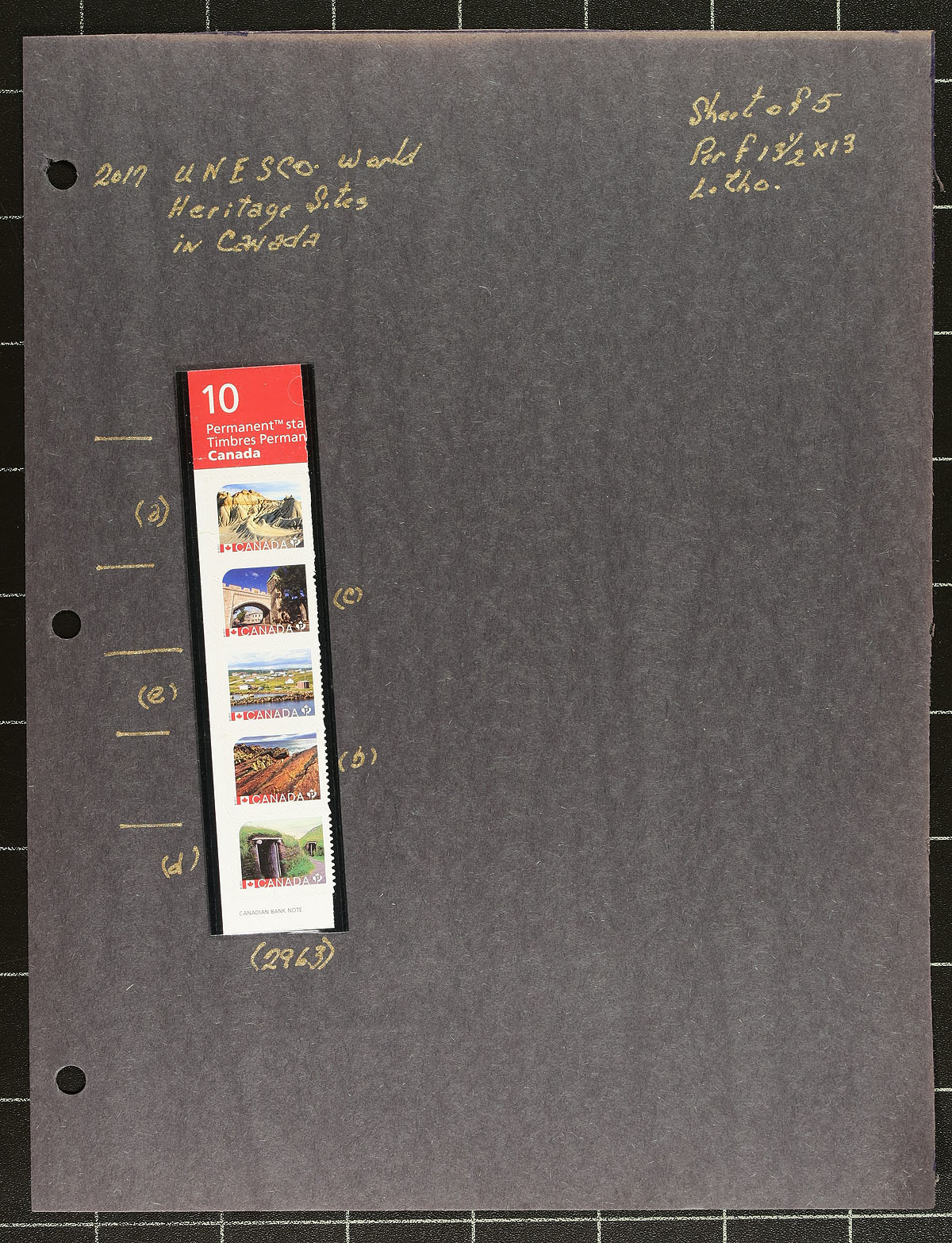 Collection of primarily mint never hinged Canada, January to February, 2017, covering Unitrade #s 2959-2975, all in hingeless mounts in roughly 15 well described pages. The collection primarily contains complete booklets, part panes, mint and used souvenir sheets, and a few first day covers. We note items cataloguing $15 and up. Face value alone totals $131.00 (including 106x "P" stamps). A nice lot for Canada collectors. 2024 Unitrade =