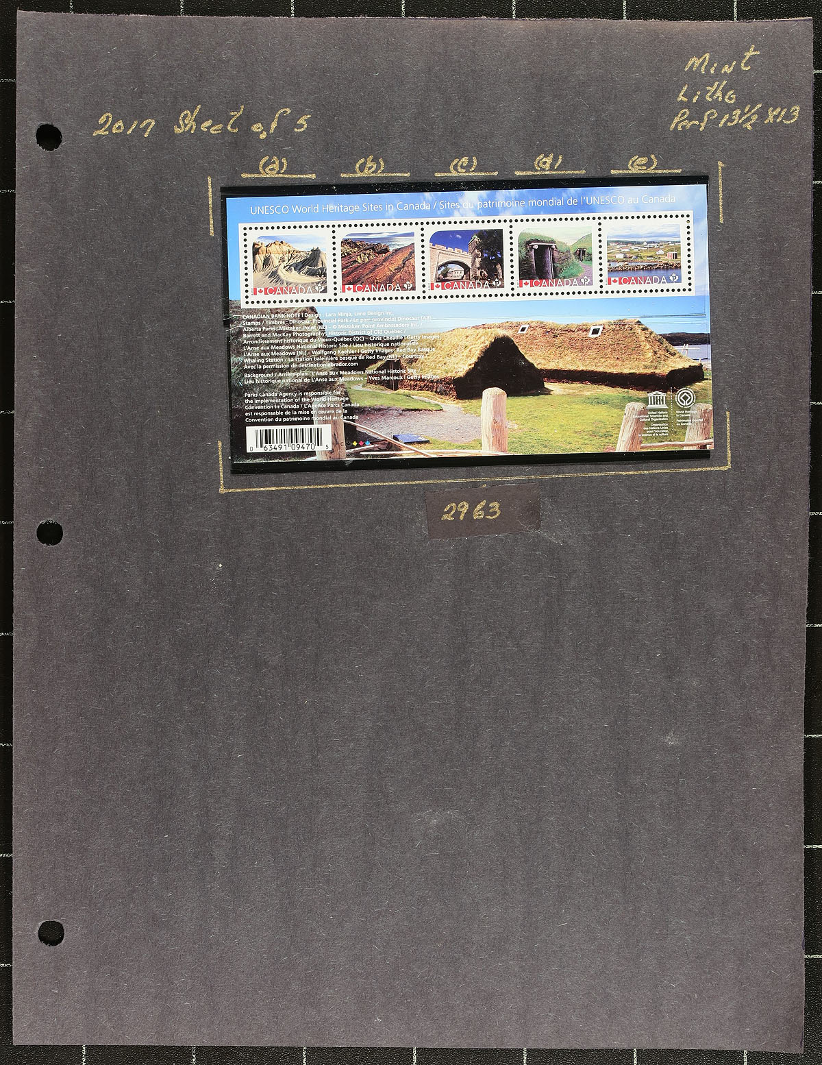 Collection of primarily mint never hinged Canada, January to February, 2017, covering Unitrade #s 2959-2975, all in hingeless mounts in roughly 15 well described pages. The collection primarily contains complete booklets, part panes, mint and used souvenir sheets, and a few first day covers. We note items cataloguing $15 and up. Face value alone totals $131.00 (including 106x "P" stamps). A nice lot for Canada collectors. 2024 Unitrade =