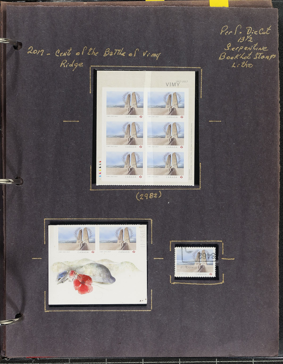 Collection of primarily mint never hinged Canada, March to April, 2017, covering Unitrade #s 2976-2991, all in hingeless mounts in roughly 20 well described pages housed in a binder. The collection primarily contains complete booklets, part panes, mint and used souvenir sheets, coil singles, pairs, strips of 4, mint and used singles, and a few first day covers. We note items cataloguing $15 and up. Face value alone totals $161.00 (including 109x "P" stamps). A nice lot for Canada collectors. 2024 Unitrade =