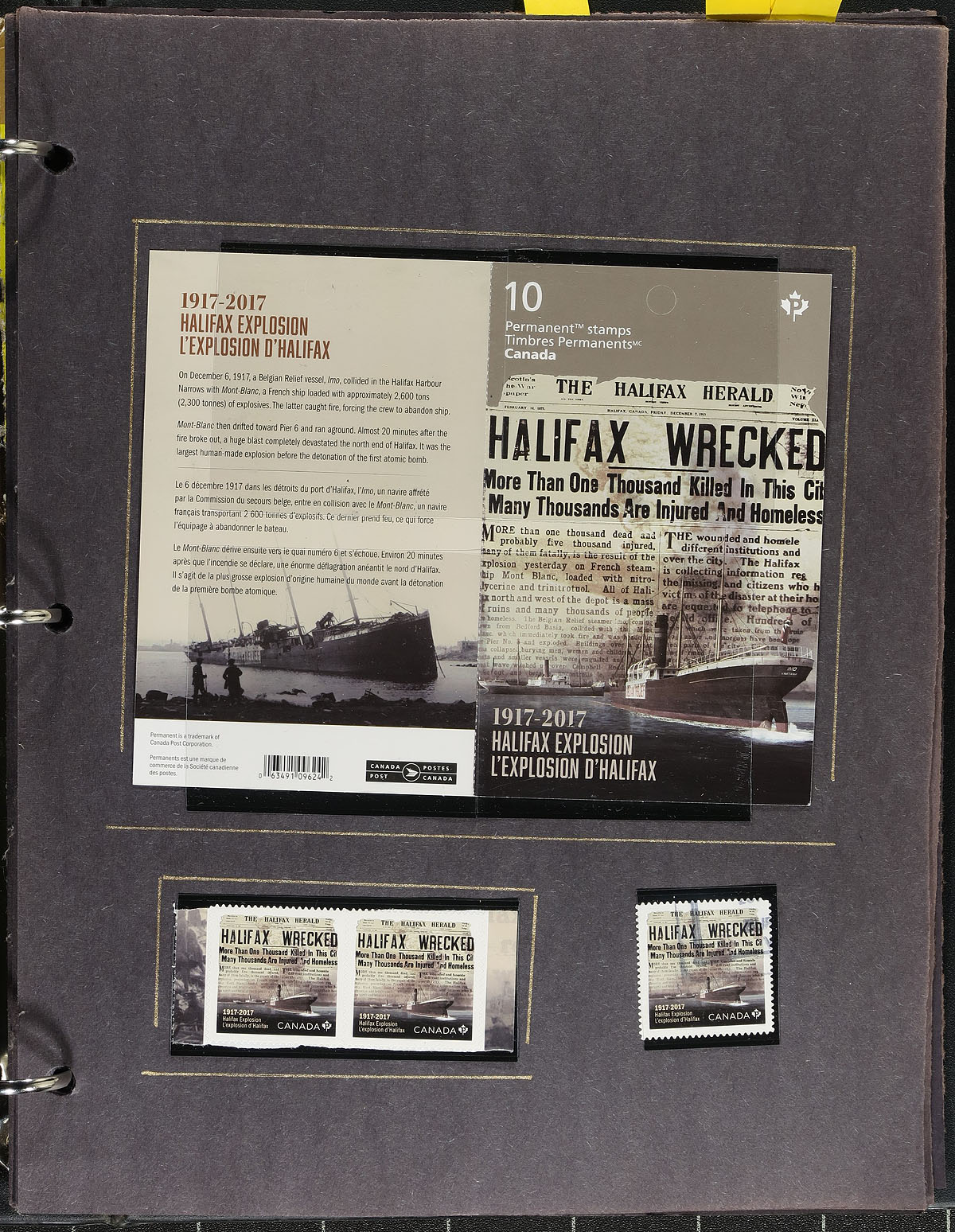 Collection of primarily mint never hinged Canada, October to November, 2017, covering Unitrade #s 3038-3044, 3050-3051, all in hingeless mounts in roughly 20 well described pages housed in a binder. The collection primarily contains complete booklets, mint and used souvenir sheets, mint and used singles, and some first day covers. We note items cataloguing $15 and up. Face value alone totals $140.00 (including 109x "P" stamps). A nice lot for Canada collectors. 2024 Unitrade =