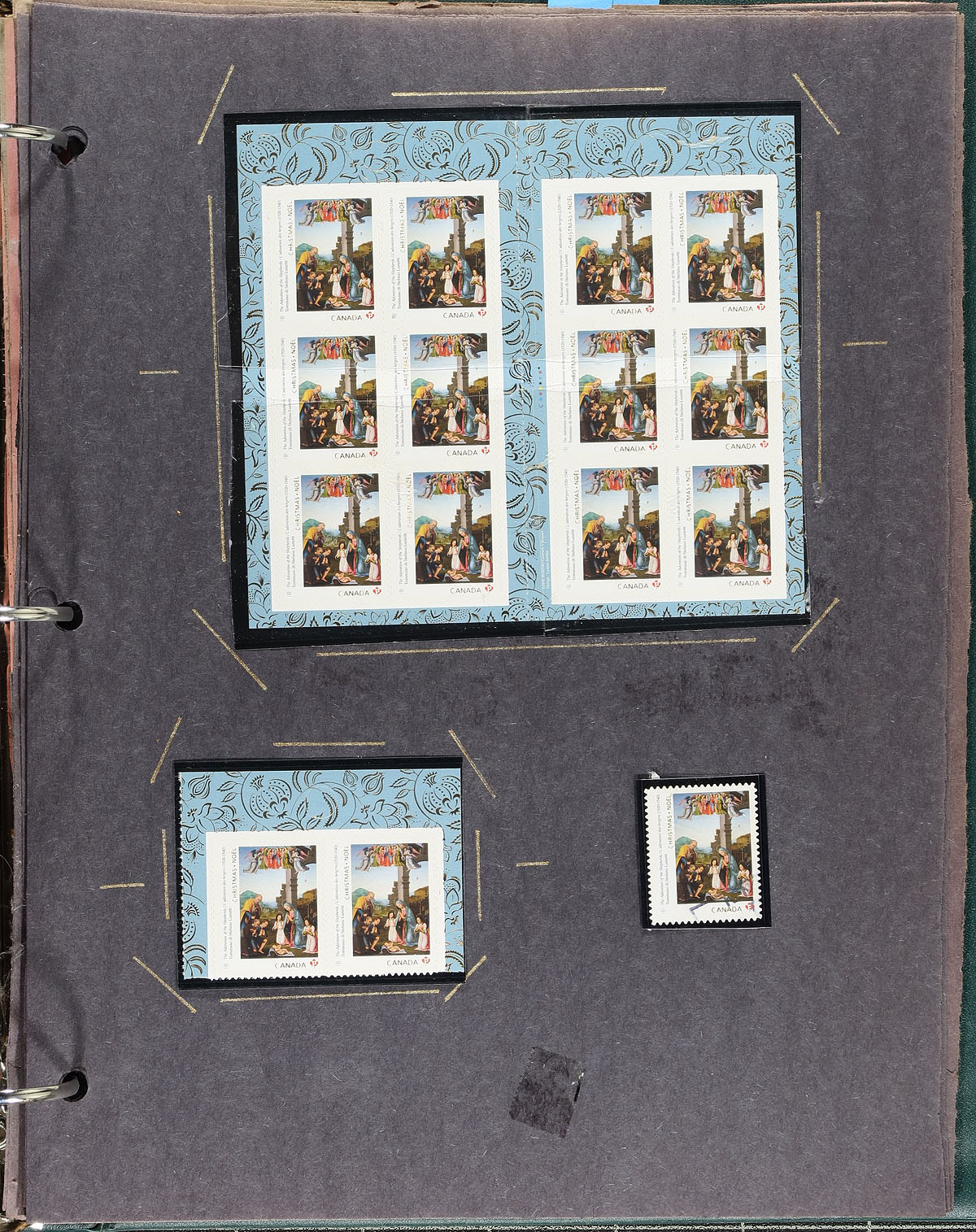 Clean collection of primarily mint never hinged "Christmas" issues, November 2017, covering Unitrade #s 3045-3049, all in hingeless mounts in roughly 12 well described pages housed in a binder. The collection primarily contains booklets, part panes, mint and used booklet singles, souvenir sheet, and a few first day covers. We note a few items cataloguing $15 and up. Face value alone totals $153.00 (including 71x "P" stamps). A nice offering for the Christmas and Canada collector. 2024 Unitrade =