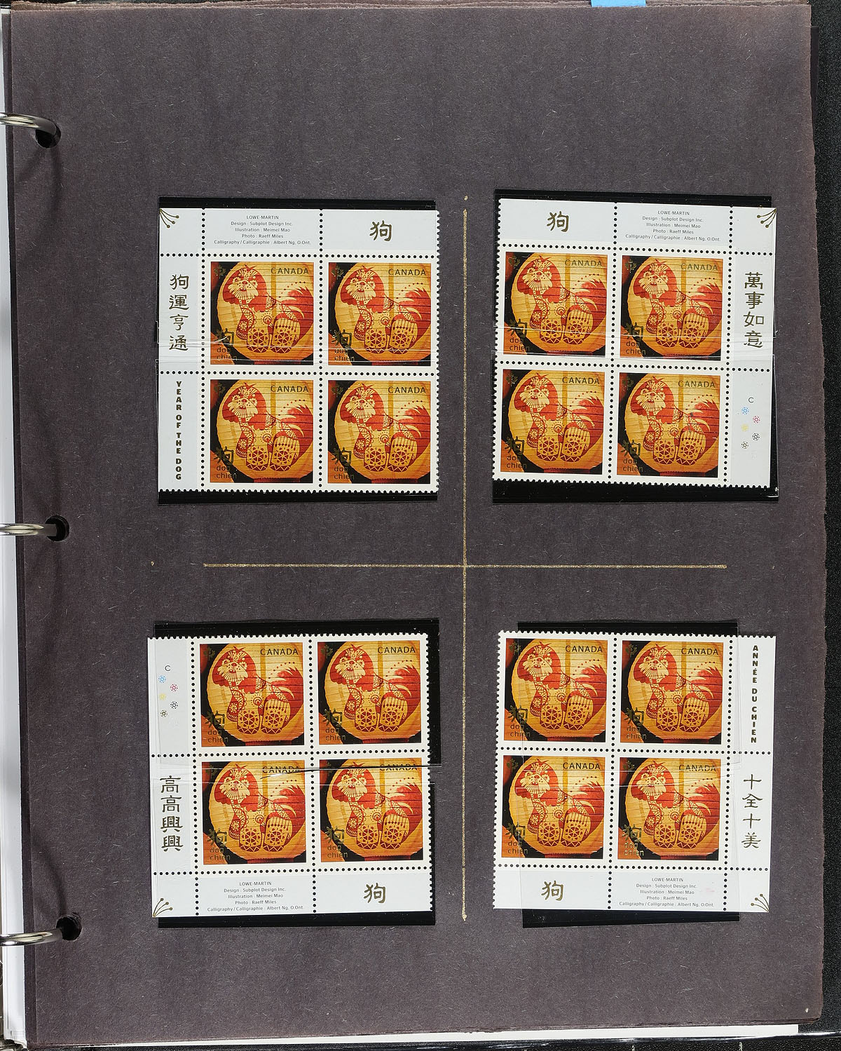 Lovely collection of primarily mint never hinged "Lunar New Year- Year of the Dog", January 2018, covering Unitrade #s 3052-3055, all in hingeless mounts in roughly 15 well described pages housed in a binder. The collection primarily contains mint and used booklet stamps, sheetlet, plate blocks, mint and used souvenir sheets, booklets, and a few first day covers. Face value alone totals $159.00 (including 84x "P" value stamps). A lovely collection for any Canada collector. 2024 Unitrade =
