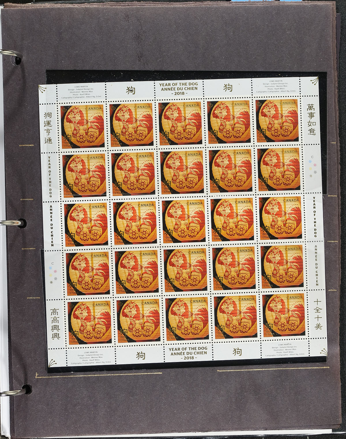 Lovely collection of primarily mint never hinged "Lunar New Year- Year of the Dog", January 2018, covering Unitrade #s 3052-3055, all in hingeless mounts in roughly 15 well described pages housed in a binder. The collection primarily contains mint and used booklet stamps, sheetlet, plate blocks, mint and used souvenir sheets, booklets, and a few first day covers. Face value alone totals $159.00 (including 84x "P" value stamps). A lovely collection for any Canada collector. 2024 Unitrade =