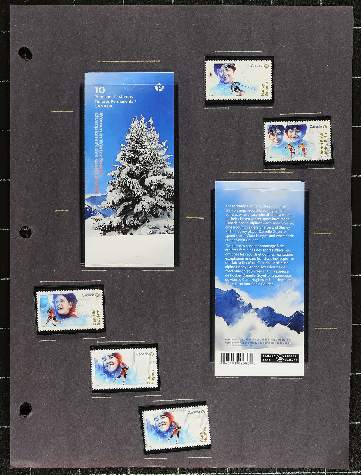 Collection of primarily mint never hinged Canada, January to February, 2018, covering Unitrade #s 3079-3086, all in hingeless mounts in roughly 15 pages. The collection primarily contains complete booklets, part panes, mint and used souvenir sheets, and a few first day covers. We note items cataloguing $15 and up. Face value alone totals $135.00 (including 109x "P" stamps). A nice lot for Canada collectors. 2024 Unitrade =