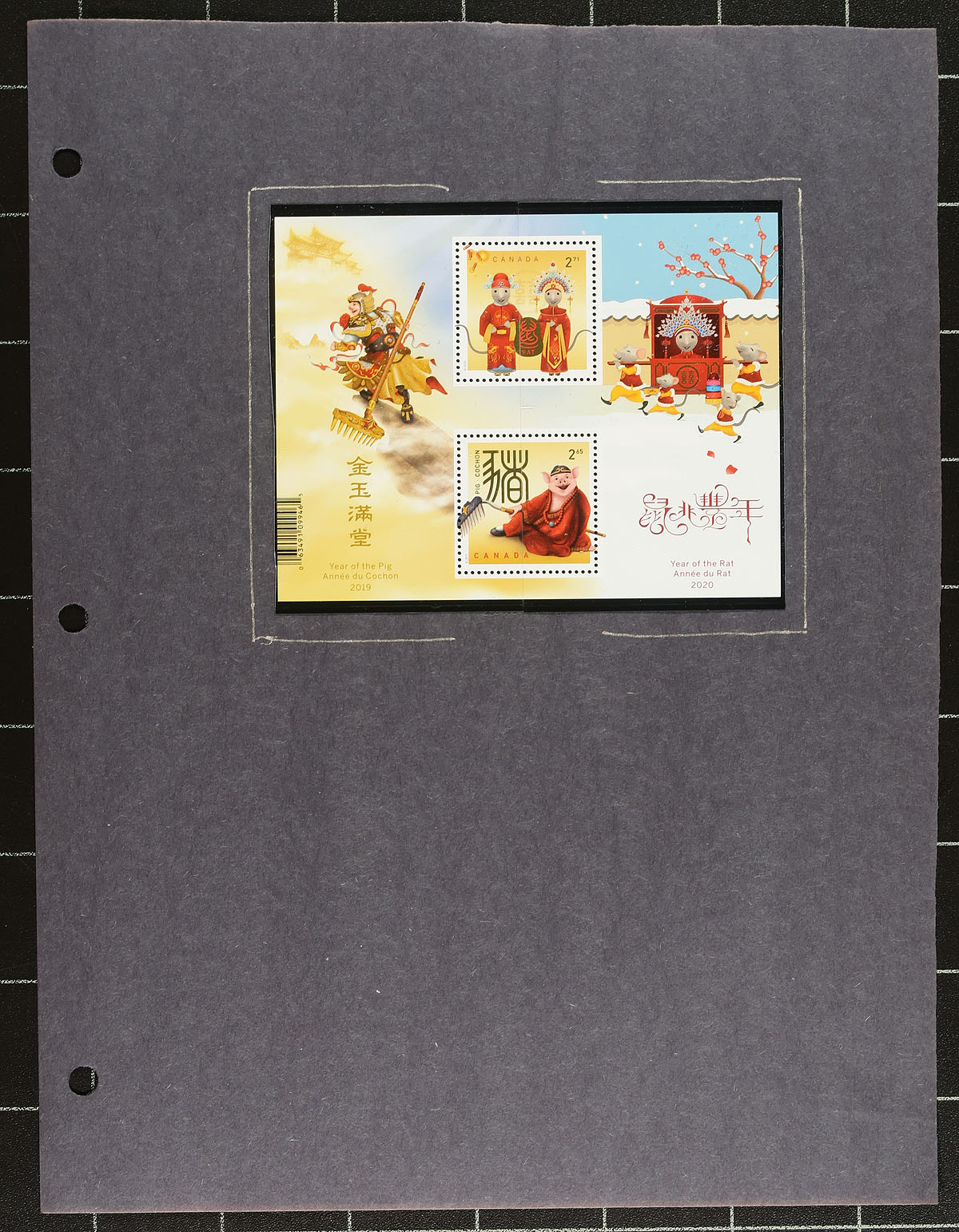 Collection of primarily mint never hinged "Lunar New Year- Year of the Rat", January 2020, covering Unitrade #s 3229-3232, all in hingeless mounts in roughly 12 well described pages. The collection primarily contains mint and used booklet stamps, sheetlet, plate blocks, mint and used souvenir sheets, booklets, and a few first day covers. Face value alone totals $158.00 (including 84x "P" value stamps). A lovely collection for any Canada collector. 2024 Unitrade =
