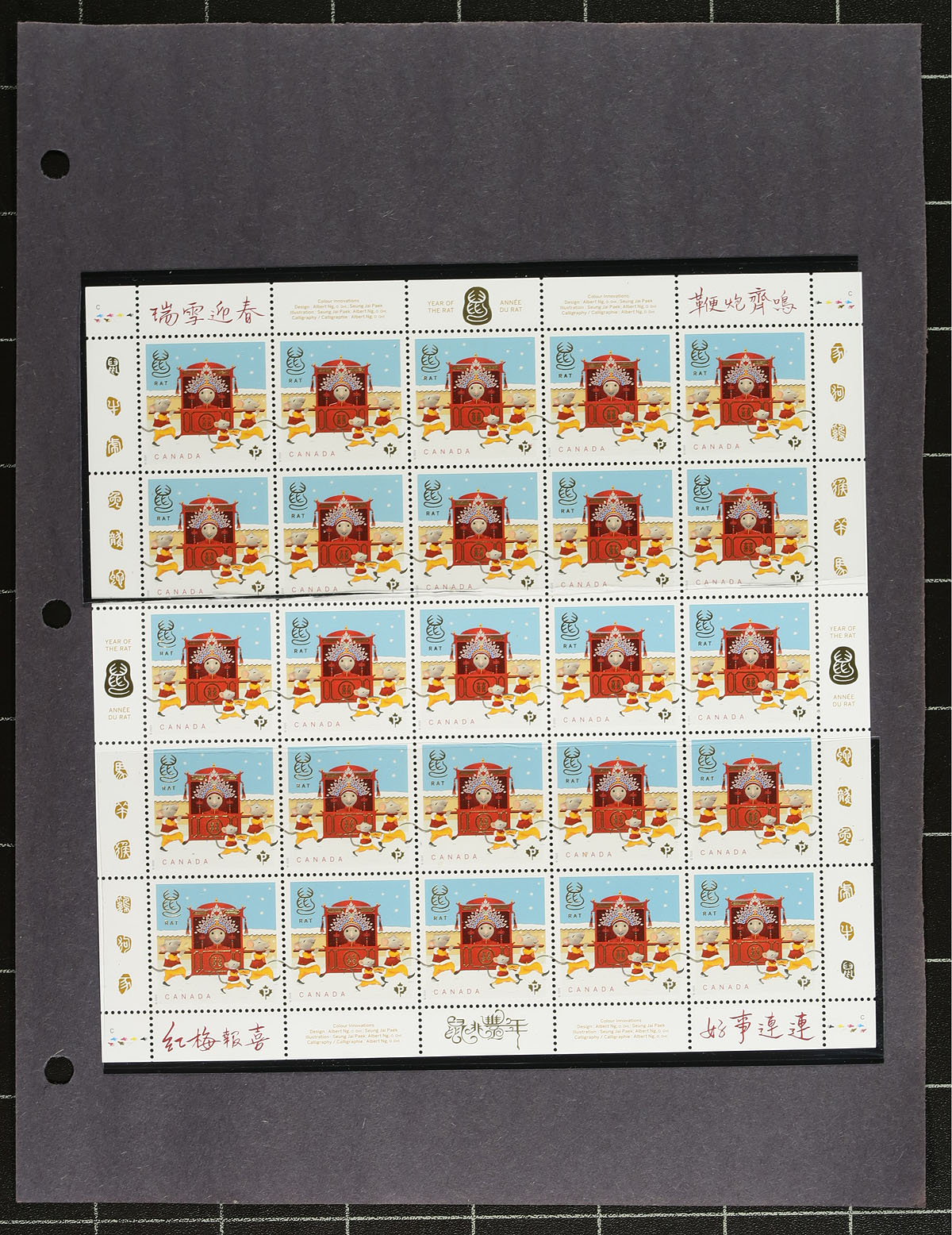 Collection of primarily mint never hinged "Lunar New Year- Year of the Rat", January 2020, covering Unitrade #s 3229-3232, all in hingeless mounts in roughly 12 well described pages. The collection primarily contains mint and used booklet stamps, sheetlet, plate blocks, mint and used souvenir sheets, booklets, and a few first day covers. Face value alone totals $158.00 (including 84x "P" value stamps). A lovely collection for any Canada collector. 2024 Unitrade =