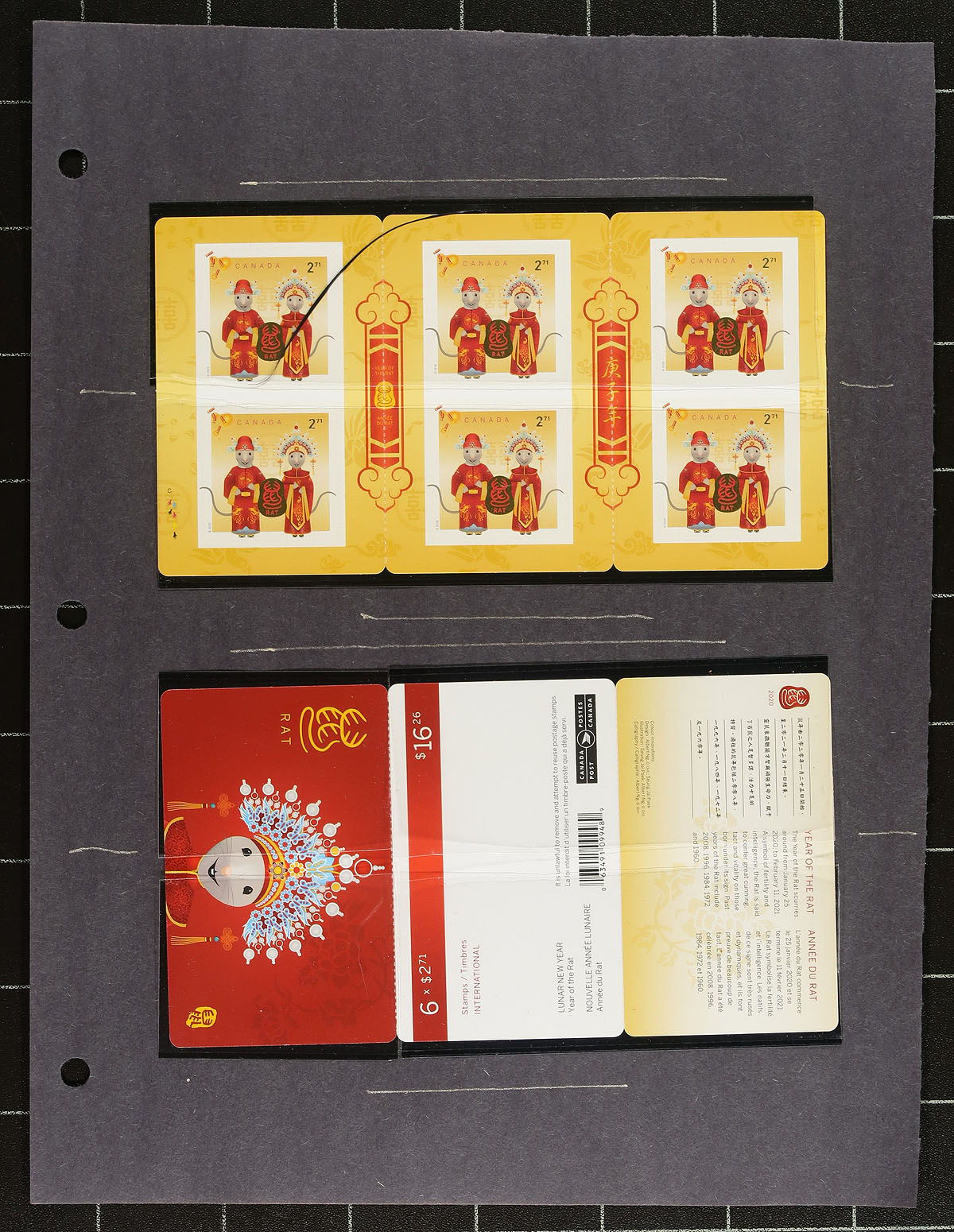 Collection of primarily mint never hinged "Lunar New Year- Year of the Rat", January 2020, covering Unitrade #s 3229-3232, all in hingeless mounts in roughly 12 well described pages. The collection primarily contains mint and used booklet stamps, sheetlet, plate blocks, mint and used souvenir sheets, booklets, and a few first day covers. Face value alone totals $158.00 (including 84x "P" value stamps). A lovely collection for any Canada collector. 2024 Unitrade =