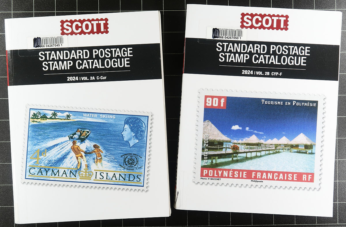 Complete 2024 Scott International stamp catalogues, all in very clean, reasonably used condition (ex. Library, so very clean). There have been no major price changes between 2024 and current catalogue. As such, this set is still extremely useful for valuing most material and the numbers don't really change. New, these 12 volumes would retail for well over $1,200.00. The Scott catalogue numbering system is the most universally recognized stamp numbering system used today. We don't usually get this new of a catalogue this quick! Estimate =