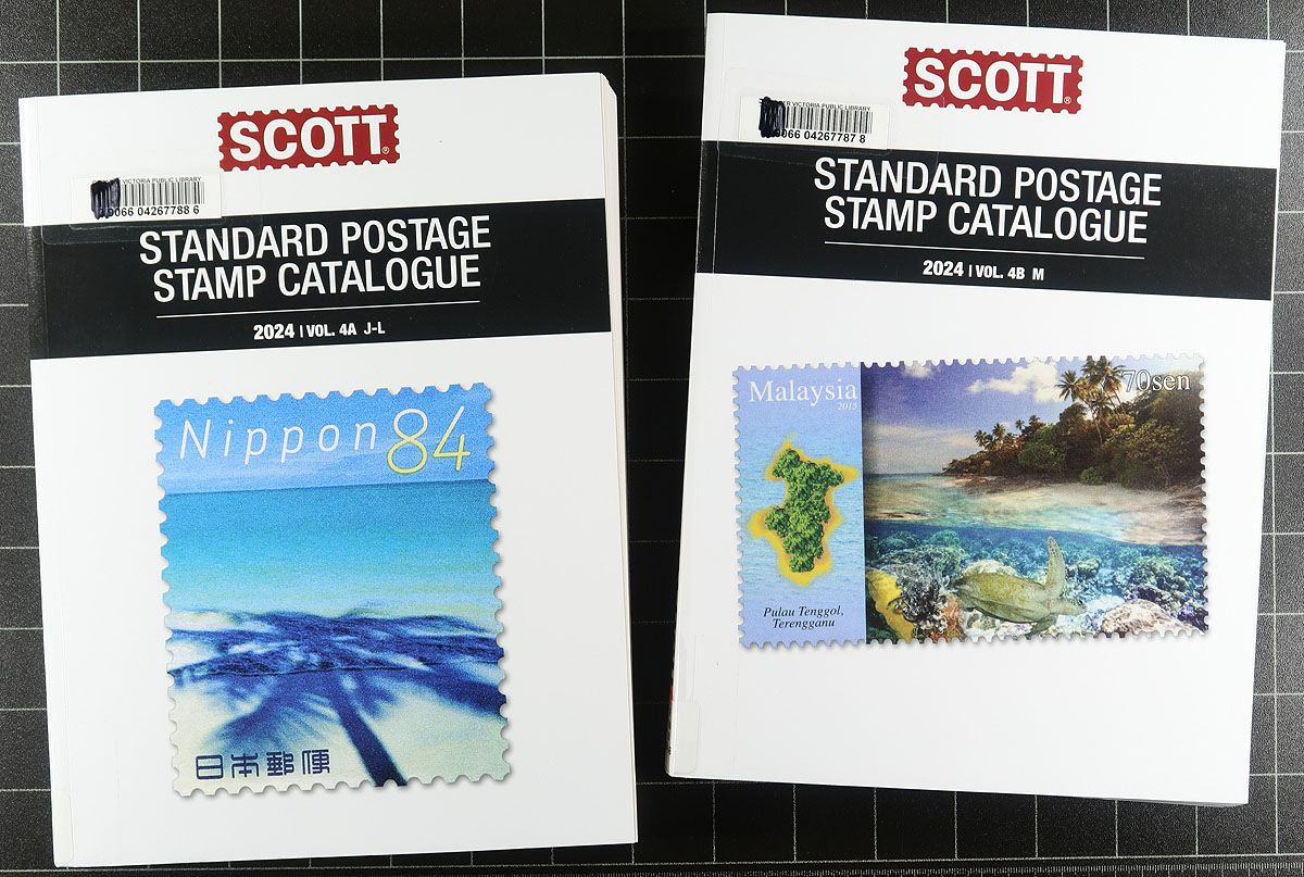 Complete 2024 Scott International stamp catalogues, all in very clean, reasonably used condition (ex. Library, so very clean). There have been no major price changes between 2024 and current catalogue. As such, this set is still extremely useful for valuing most material and the numbers don't really change. New, these 12 volumes would retail for well over $1,200.00. The Scott catalogue numbering system is the most universally recognized stamp numbering system used today. We don't usually get this new of a catalogue this quick! Estimate =