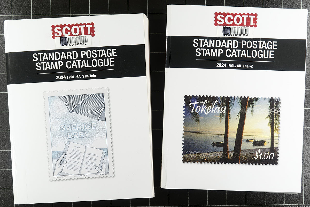 Complete 2024 Scott International stamp catalogues, all in very clean, reasonably used condition (ex. Library, so very clean). There have been no major price changes between 2024 and current catalogue. As such, this set is still extremely useful for valuing most material and the numbers don't really change. New, these 12 volumes would retail for well over $1,200.00. The Scott catalogue numbering system is the most universally recognized stamp numbering system used today. We don't usually get this new of a catalogue this quick! Estimate =