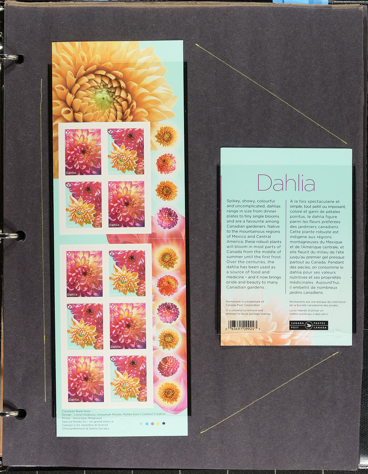 Group of primarily mint never hinged Canada, September 2019 to May 2020, covering Unitrade #s 3195-3198, 3205, 3233-3245, all in hingeless mounts in roughly 25 pages housed in a binder. The lot primarily contains booklets, part panes, souvenir sheet, coil singles, pairs, strips of 4, and some first day covers. We note some items cataloguing $15 and up. Face value alone totals $186.00 (noting 150x "P" stamps). A nice clean group for Canada collectors. 2024 Unitrade =