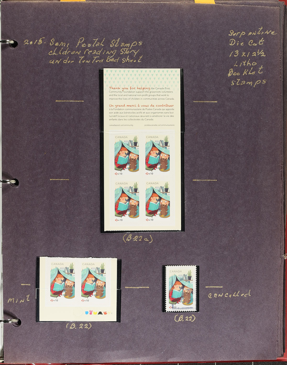 Collection of primarily mint never hinged Canada "Semi-Postal" issues from 2015-2017, 2019 issues, covering Unitrade #s B22-B26, B28-B29, all in hingeless in roughly 20 pages housed in a binder. The lot primarily contains booklets, part panes, singles, and some first day covers.. Face value alone totals $164.00 (noting 133x "P" stamps). A clean collection for all collectors. 2024 Unitrade =