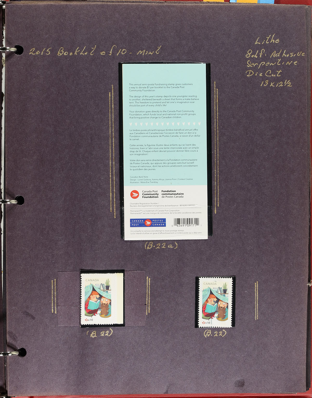 Collection of primarily mint never hinged Canada "Semi-Postal" issues from 2015-2017, 2019 issues, covering Unitrade #s B22-B26, B28-B29, all in hingeless in roughly 20 pages housed in a binder. The lot primarily contains booklets, part panes, singles, and some first day covers.. Face value alone totals $164.00 (noting 133x "P" stamps). A clean collection for all collectors. 2024 Unitrade =