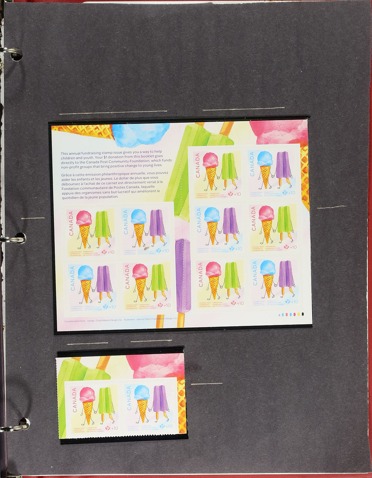 Collection of primarily mint never hinged Canada "Semi-Postal" issues from 2015-2017, 2019 issues, covering Unitrade #s B22-B26, B28-B29, all in hingeless in roughly 20 pages housed in a binder. The lot primarily contains booklets, part panes, singles, and some first day covers.. Face value alone totals $164.00 (noting 133x "P" stamps). A clean collection for all collectors. 2024 Unitrade =