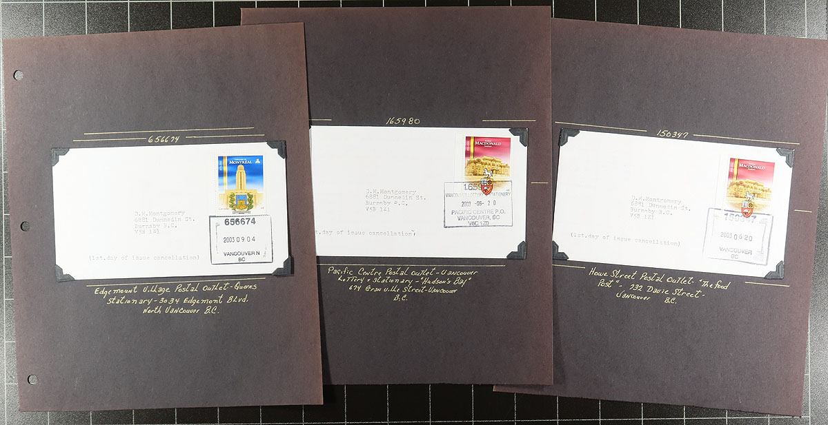 British Columbia Postmarks / FDC Part A. Collection of Canada first day covers filling a Uhaul carton. The collection contains many hundreds of covers from issues ranging in years 2000 to 2003, with each cover on a well described page, noting singles, plate blocks, and souvenir sheet frankings. The lot contains no official first day covers, as the collector meticulously collected first day covers with Vancouver and lower mainland postmarks, with most pages indicating the variety of postal outlets. Some issues have up to 10 first day covers (from a variety of different cities or outlets within each city). Ideal for the first day cover or British Columbia postmark collector, as this would be a near impossible collection to duplicate. Estimate =