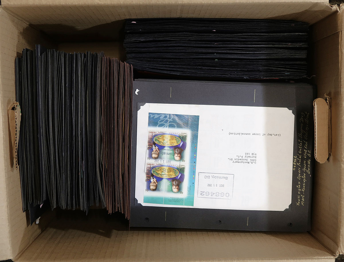 British Columbia Postmarks / FDC Part A. Collection of Canada first day covers filling a Uhaul carton. The collection contains many hundreds of covers from issues ranging in years 2000 to 2003, with each cover on a well described page, noting singles, plate blocks, and souvenir sheet frankings. The lot contains no official first day covers, as the collector meticulously collected first day covers with Vancouver and lower mainland postmarks, with most pages indicating the variety of postal outlets. Some issues have up to 10 first day covers (from a variety of different cities or outlets within each city). Ideal for the first day cover or British Columbia postmark collector, as this would be a near impossible collection to duplicate. Estimate =