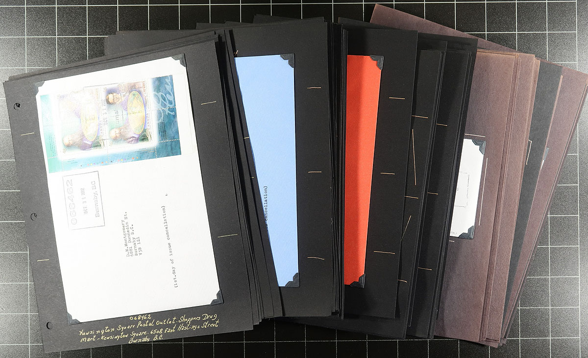 British Columbia Postmarks / FDC Part A. Collection of Canada first day covers filling a Uhaul carton. The collection contains many hundreds of covers from issues ranging in years 2000 to 2003, with each cover on a well described page, noting singles, plate blocks, and souvenir sheet frankings. The lot contains no official first day covers, as the collector meticulously collected first day covers with Vancouver and lower mainland postmarks, with most pages indicating the variety of postal outlets. Some issues have up to 10 first day covers (from a variety of different cities or outlets within each city). Ideal for the first day cover or British Columbia postmark collector, as this would be a near impossible collection to duplicate. Estimate =