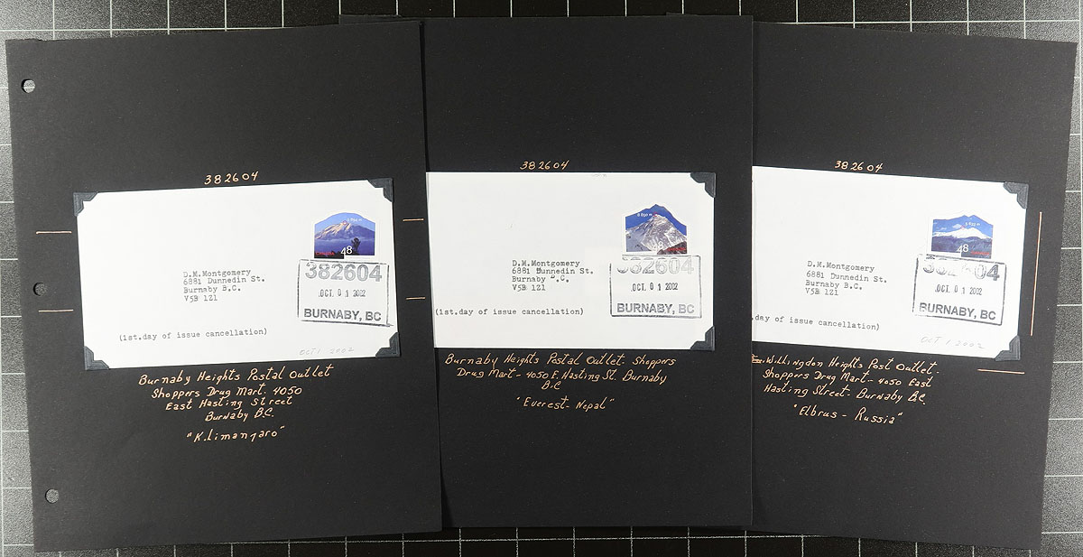 British Columbia Postmarks / FDC Part A. Collection of Canada first day covers filling a Uhaul carton. The collection contains many hundreds of covers from issues ranging in years 2000 to 2003, with each cover on a well described page, noting singles, plate blocks, and souvenir sheet frankings. The lot contains no official first day covers, as the collector meticulously collected first day covers with Vancouver and lower mainland postmarks, with most pages indicating the variety of postal outlets. Some issues have up to 10 first day covers (from a variety of different cities or outlets within each city). Ideal for the first day cover or British Columbia postmark collector, as this would be a near impossible collection to duplicate. Estimate =