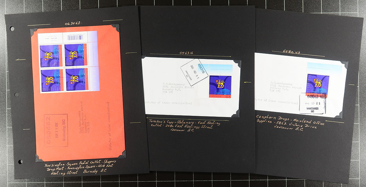 British Columbia Postmarks / FDC Part A. Collection of Canada first day covers filling a Uhaul carton. The collection contains many hundreds of covers from issues ranging in years 2000 to 2003, with each cover on a well described page, noting singles, plate blocks, and souvenir sheet frankings. The lot contains no official first day covers, as the collector meticulously collected first day covers with Vancouver and lower mainland postmarks, with most pages indicating the variety of postal outlets. Some issues have up to 10 first day covers (from a variety of different cities or outlets within each city). Ideal for the first day cover or British Columbia postmark collector, as this would be a near impossible collection to duplicate. Estimate =