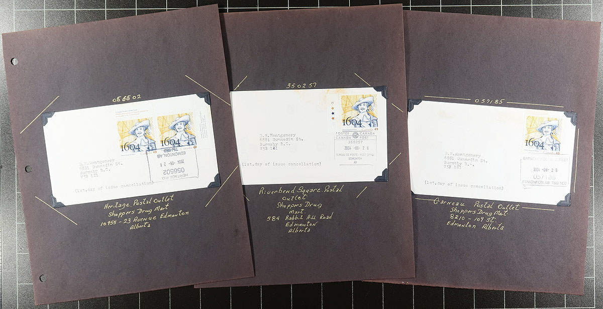 British Columbia Postmarks / FDC Part B. Collection of Canada first day covers filling a Uhaul carton. The collection contains many hundreds of covers from issues ranging in years 2004 to 2008, with each cover on a well described page, noting singles, plate blocks, and souvenir sheet frankings. The lot contains no official first day covers, as the collector meticulously collected first day covers with Vancouver and lower mainland postmarks, with most pages indicating the variety of postal outlets. Some issues have up to 10 first day covers (from a variety of different cities or outlets within each city). Ideal for the first day cover or British Columbia postmark collector, as this would be a near impossible collection to duplicate. Estimate =