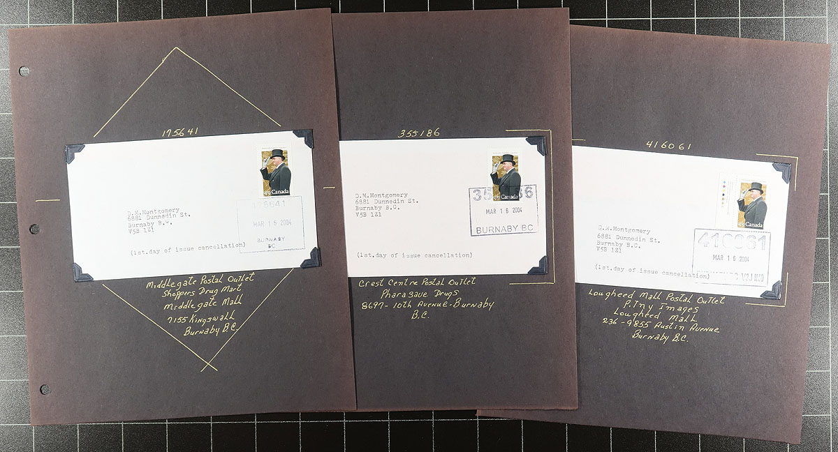British Columbia Postmarks / FDC Part B. Collection of Canada first day covers filling a Uhaul carton. The collection contains many hundreds of covers from issues ranging in years 2004 to 2008, with each cover on a well described page, noting singles, plate blocks, and souvenir sheet frankings. The lot contains no official first day covers, as the collector meticulously collected first day covers with Vancouver and lower mainland postmarks, with most pages indicating the variety of postal outlets. Some issues have up to 10 first day covers (from a variety of different cities or outlets within each city). Ideal for the first day cover or British Columbia postmark collector, as this would be a near impossible collection to duplicate. Estimate =