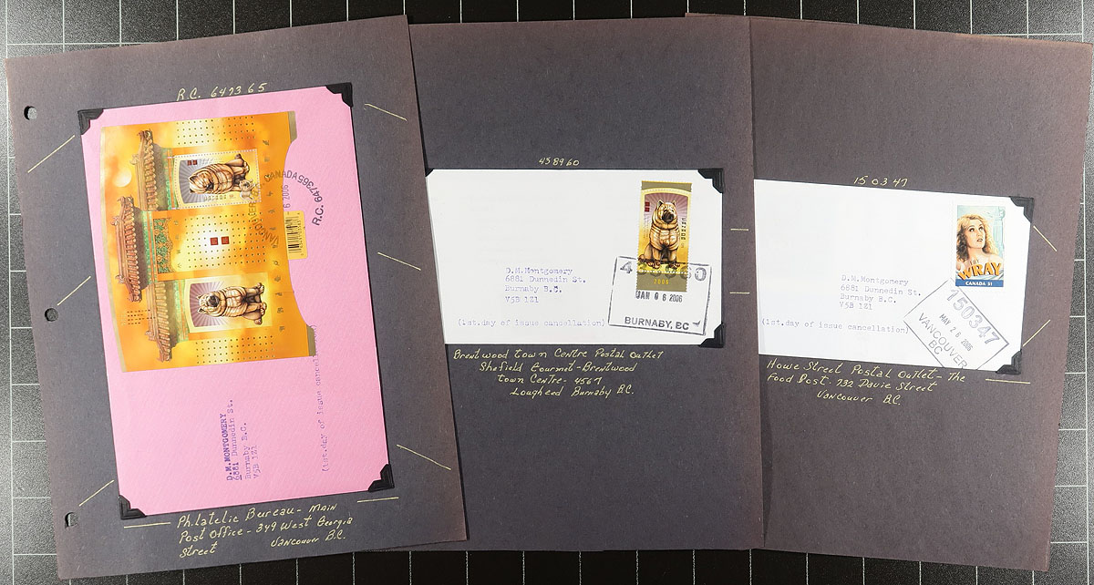 British Columbia Postmarks / FDC Part B. Collection of Canada first day covers filling a Uhaul carton. The collection contains many hundreds of covers from issues ranging in years 2004 to 2008, with each cover on a well described page, noting singles, plate blocks, and souvenir sheet frankings. The lot contains no official first day covers, as the collector meticulously collected first day covers with Vancouver and lower mainland postmarks, with most pages indicating the variety of postal outlets. Some issues have up to 10 first day covers (from a variety of different cities or outlets within each city). Ideal for the first day cover or British Columbia postmark collector, as this would be a near impossible collection to duplicate. Estimate =