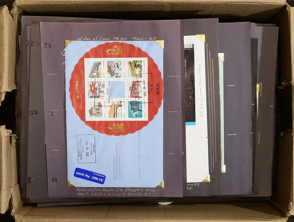 British Columbia Postmarks / FDC Part C. Collection of Canada first day covers filling a Uhaul carton. The collection contains many hundreds of covers from issues ranging in years 2009 to 2015, with each cover on a well described page, noting singles, plate blocks, and souvenir sheet frankings. The lot contains no official first day covers, as the collector meticulously collected first day covers with Vancouver and lower mainland postmarks, with most pages indicating the variety of postal outlets. Some issues have up to 10 first day covers (from a variety of different cities or outlets within each city). Ideal for the first day cover or British Columbia postmark collector, as this would be a near impossible collection to duplicate. Estimate =