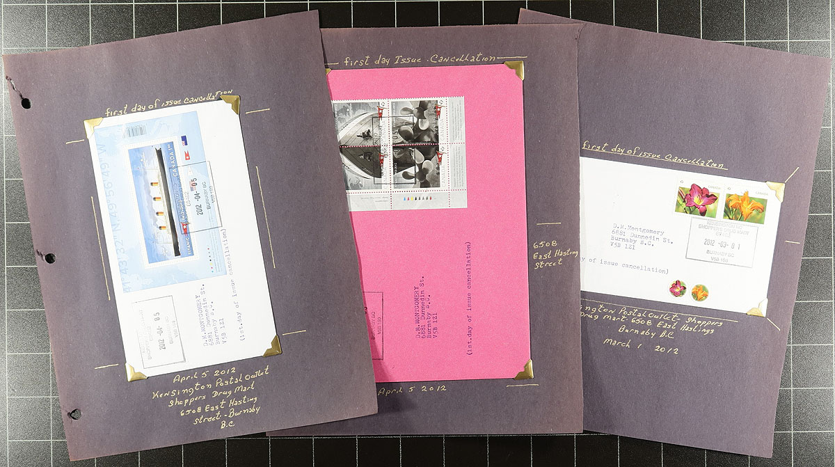 British Columbia Postmarks / FDC Part C. Collection of Canada first day covers filling a Uhaul carton. The collection contains many hundreds of covers from issues ranging in years 2009 to 2015, with each cover on a well described page, noting singles, plate blocks, and souvenir sheet frankings. The lot contains no official first day covers, as the collector meticulously collected first day covers with Vancouver and lower mainland postmarks, with most pages indicating the variety of postal outlets. Some issues have up to 10 first day covers (from a variety of different cities or outlets within each city). Ideal for the first day cover or British Columbia postmark collector, as this would be a near impossible collection to duplicate. Estimate =