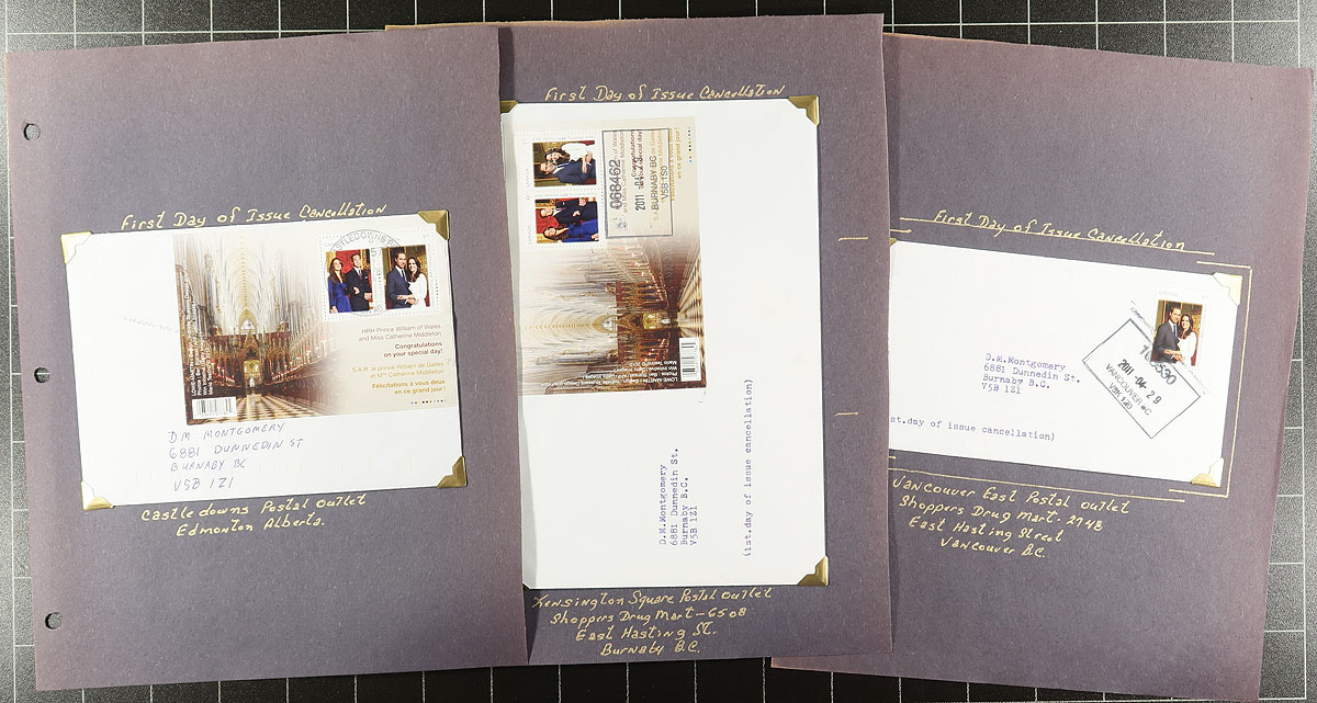 British Columbia Postmarks / FDC Part C. Collection of Canada first day covers filling a Uhaul carton. The collection contains many hundreds of covers from issues ranging in years 2009 to 2015, with each cover on a well described page, noting singles, plate blocks, and souvenir sheet frankings. The lot contains no official first day covers, as the collector meticulously collected first day covers with Vancouver and lower mainland postmarks, with most pages indicating the variety of postal outlets. Some issues have up to 10 first day covers (from a variety of different cities or outlets within each city). Ideal for the first day cover or British Columbia postmark collector, as this would be a near impossible collection to duplicate. Estimate =