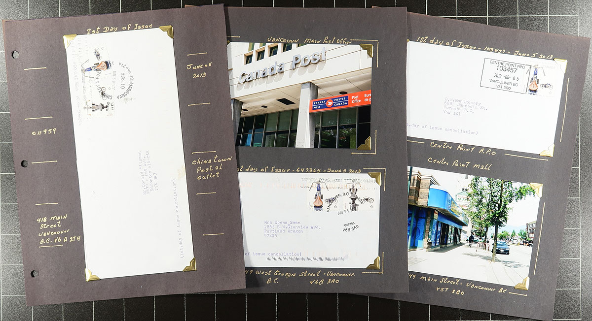 British Columbia Postmarks / FDC Part C. Collection of Canada first day covers filling a Uhaul carton. The collection contains many hundreds of covers from issues ranging in years 2009 to 2015, with each cover on a well described page, noting singles, plate blocks, and souvenir sheet frankings. The lot contains no official first day covers, as the collector meticulously collected first day covers with Vancouver and lower mainland postmarks, with most pages indicating the variety of postal outlets. Some issues have up to 10 first day covers (from a variety of different cities or outlets within each city). Ideal for the first day cover or British Columbia postmark collector, as this would be a near impossible collection to duplicate. Estimate =