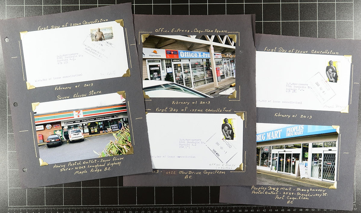 British Columbia Postmarks / FDC Part C. Collection of Canada first day covers filling a Uhaul carton. The collection contains many hundreds of covers from issues ranging in years 2009 to 2015, with each cover on a well described page, noting singles, plate blocks, and souvenir sheet frankings. The lot contains no official first day covers, as the collector meticulously collected first day covers with Vancouver and lower mainland postmarks, with most pages indicating the variety of postal outlets. Some issues have up to 10 first day covers (from a variety of different cities or outlets within each city). Ideal for the first day cover or British Columbia postmark collector, as this would be a near impossible collection to duplicate. Estimate =