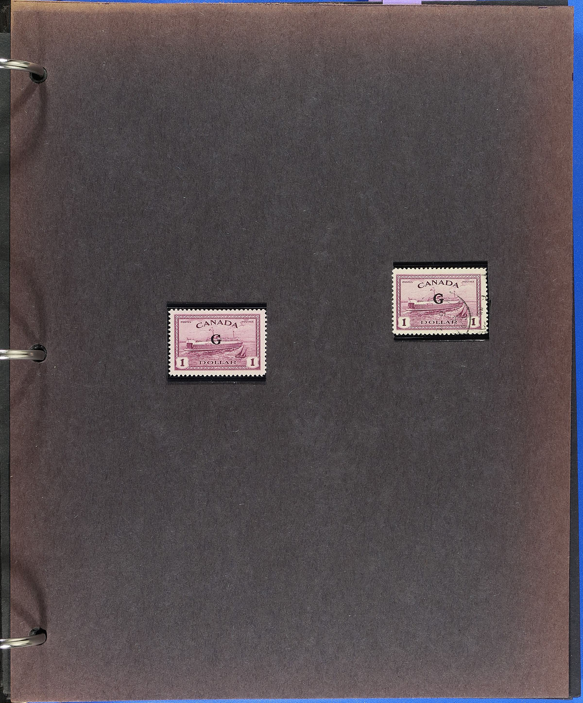 Collection of mint and used Canada overprints "Officials", 1949-1963, containing roughly 300 stamps ranging from O1/O49, on roughly 60 pages housed in a binder. The collection generally contains a mint and a used example for most issues, along with a few plate blocks and multiples (mostly with the Wildings issues), noting better items with Scott #s O10 (mh, $75), O25 (nh, and used, $155 total), O27 (used, $57), along with a few items cataloguing $10 and up. A nice lot for the Canada back of the book collector. 2025 Scott US$746.00 =