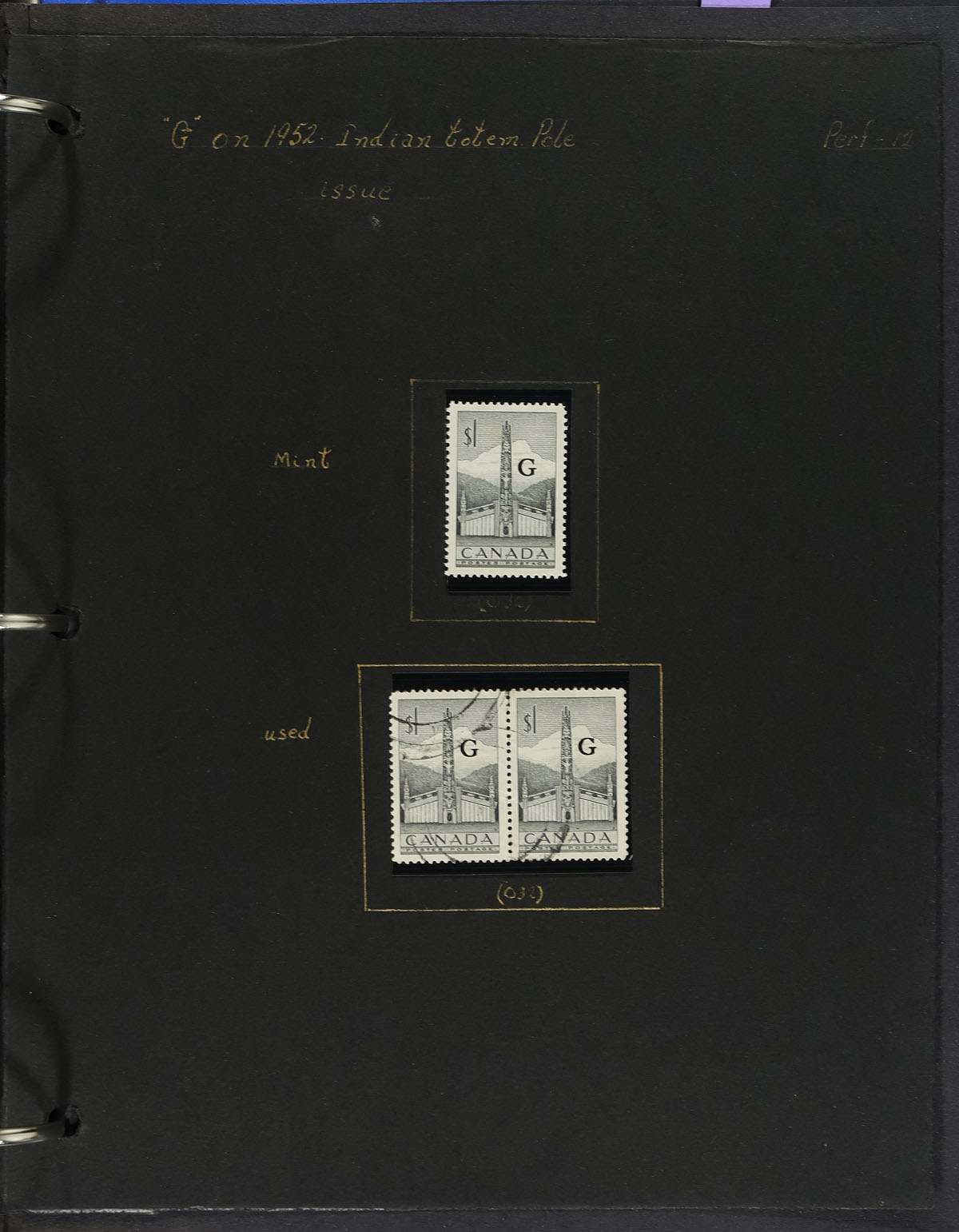 Collection of mint and used Canada overprints "Officials", 1949-1963, containing roughly 300 stamps ranging from O1/O49, on roughly 60 pages housed in a binder. The collection generally contains a mint and a used example for most issues, along with a few plate blocks and multiples (mostly with the Wildings issues), noting better items with Scott #s O10 (mh, $75), O25 (nh, and used, $155 total), O27 (used, $57), along with a few items cataloguing $10 and up. A nice lot for the Canada back of the book collector. 2025 Scott US$746.00 =