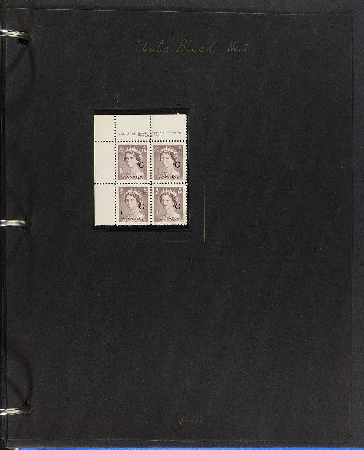 Collection of mint and used Canada overprints "Officials", 1949-1963, containing roughly 300 stamps ranging from O1/O49, on roughly 60 pages housed in a binder. The collection generally contains a mint and a used example for most issues, along with a few plate blocks and multiples (mostly with the Wildings issues), noting better items with Scott #s O10 (mh, $75), O25 (nh, and used, $155 total), O27 (used, $57), along with a few items cataloguing $10 and up. A nice lot for the Canada back of the book collector. 2025 Scott US$746.00 =