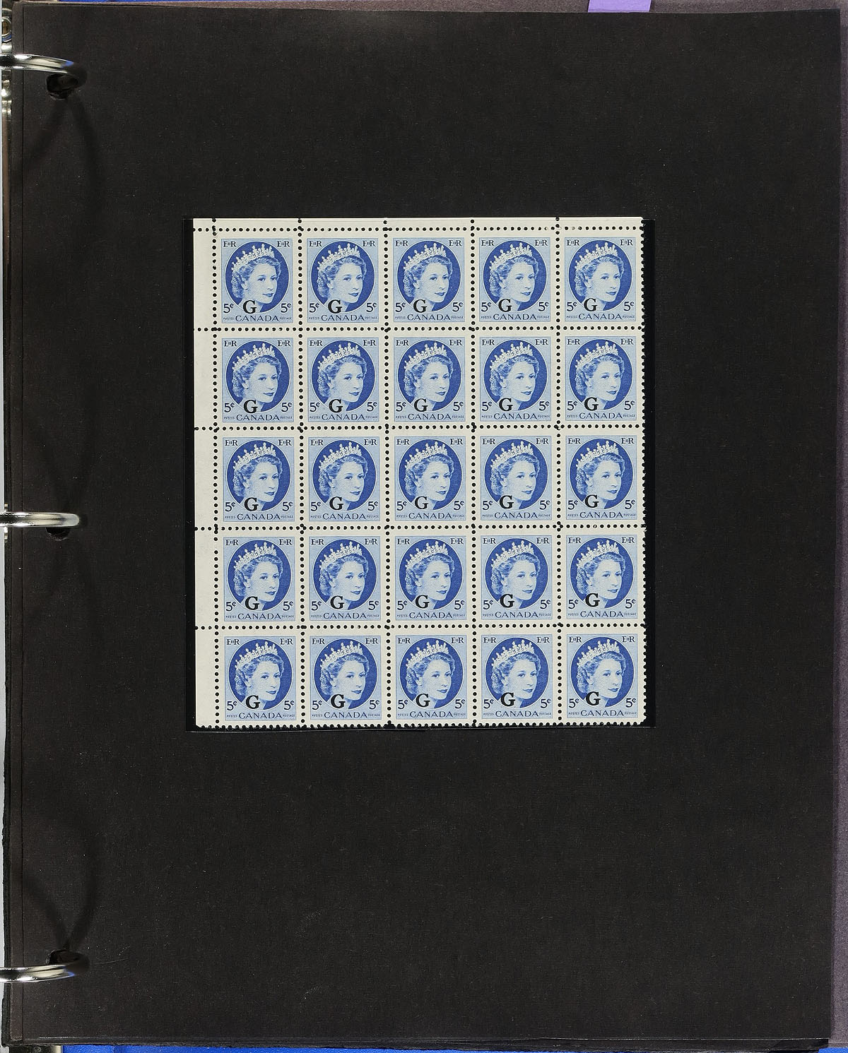 Collection of mint and used Canada overprints "Officials", 1949-1963, containing roughly 300 stamps ranging from O1/O49, on roughly 60 pages housed in a binder. The collection generally contains a mint and a used example for most issues, along with a few plate blocks and multiples (mostly with the Wildings issues), noting better items with Scott #s O10 (mh, $75), O25 (nh, and used, $155 total), O27 (used, $57), along with a few items cataloguing $10 and up. A nice lot for the Canada back of the book collector. 2025 Scott US$746.00 =
