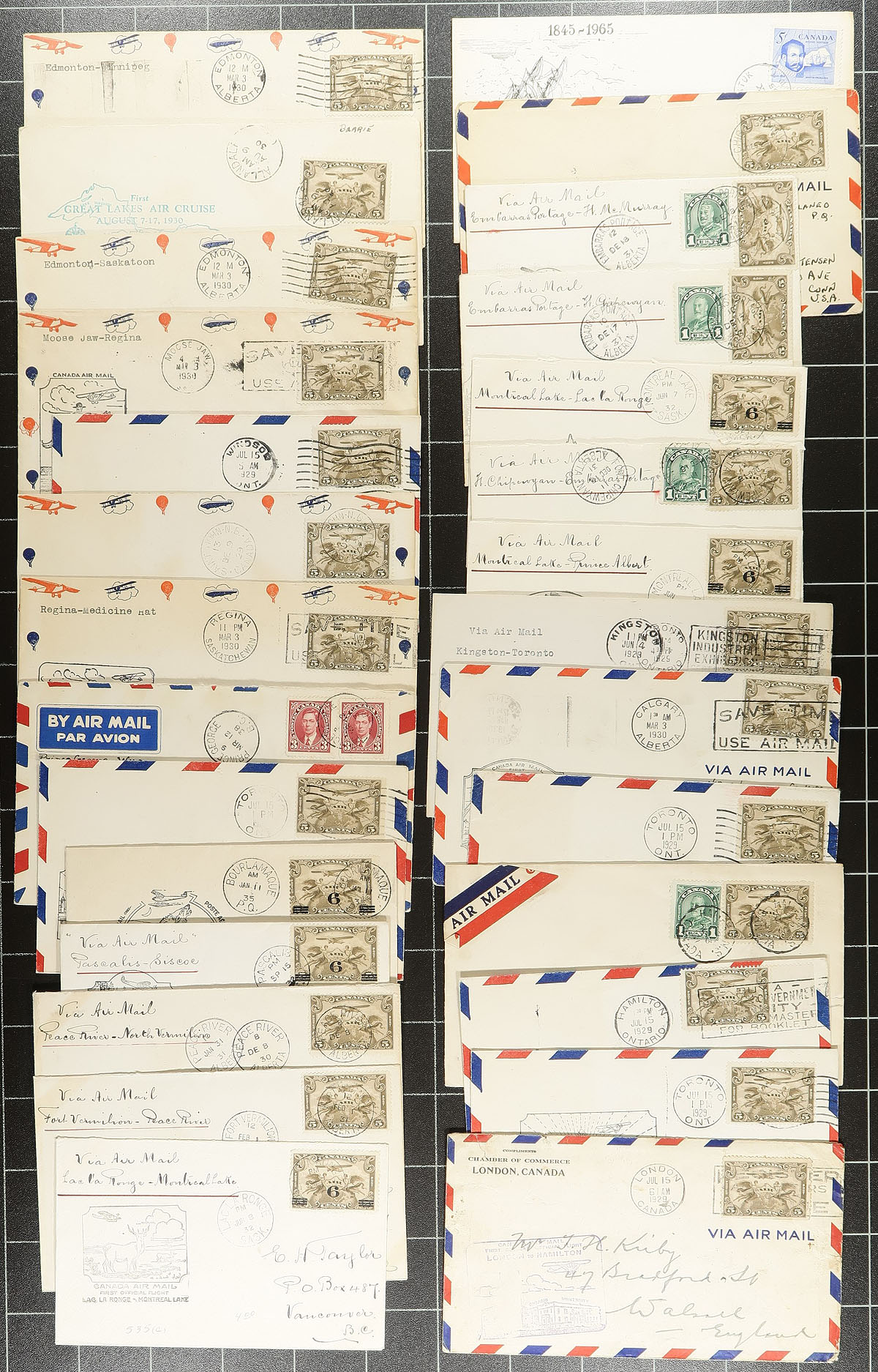 First Flight Covers. Group of 110 Canada First Flight Covers, ranging from 1929 to 1937, with the majority having C1, C3-C6 frankings, with a few having 1930's definitive issue frankings. We note C4 first day covers (x3, Unitrade c.v. $120 total), with first flights covering Quebec, Ontario, western provinces, and the Territories. A nice lot for the airmail collector. Estimate =