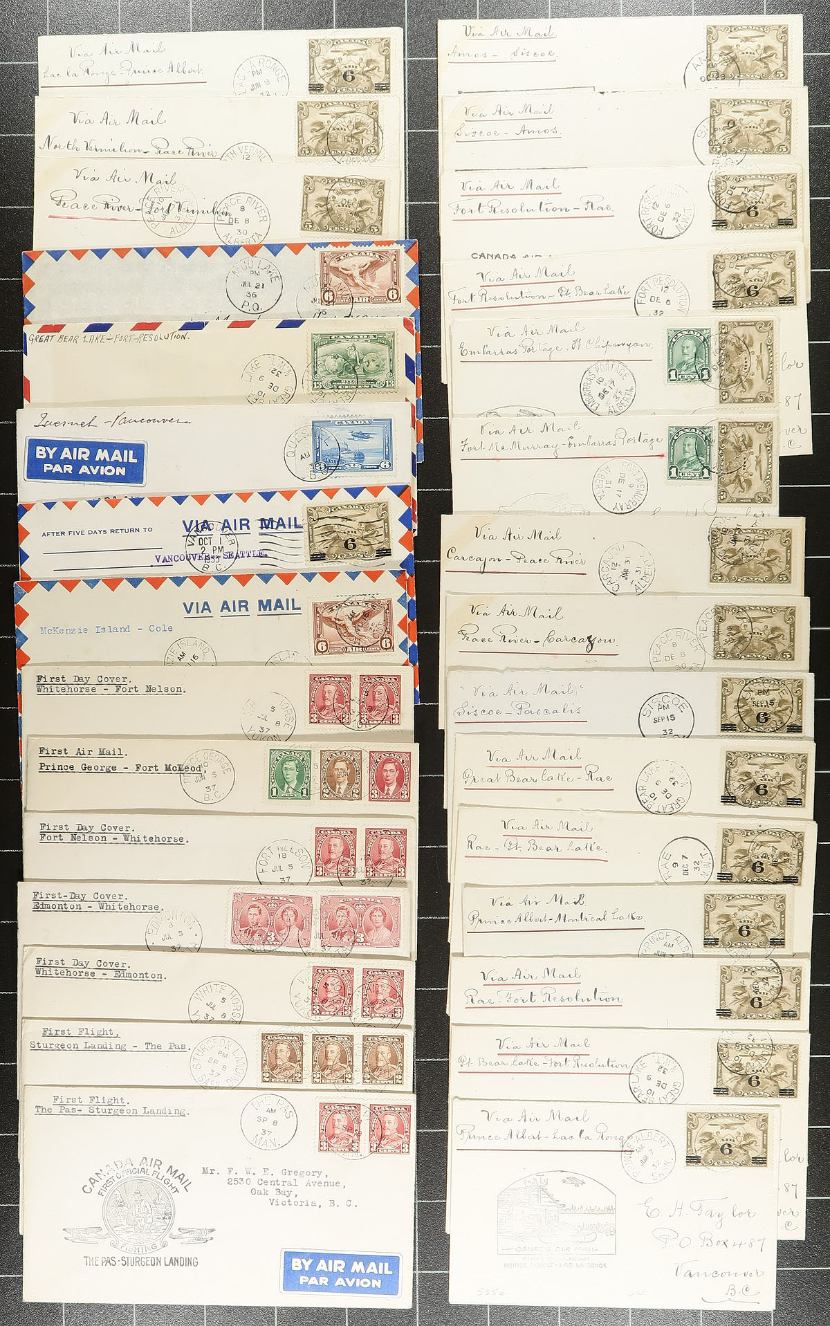 First Flight Covers. Group of 110 Canada First Flight Covers, ranging from 1929 to 1937, with the majority having C1, C3-C6 frankings, with a few having 1930's definitive issue frankings. We note C4 first day covers (x3, Unitrade c.v. $120 total), with first flights covering Quebec, Ontario, western provinces, and the Territories. A nice lot for the airmail collector. Estimate =