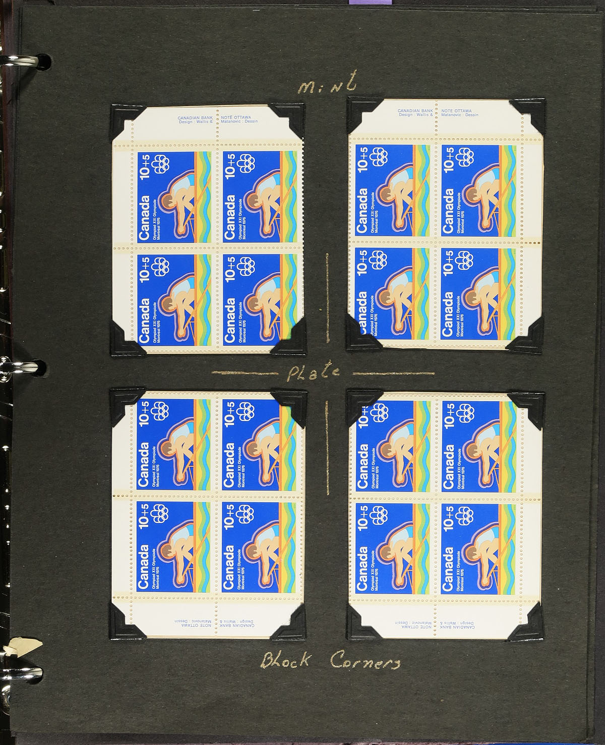 Lovely collection of Canada "Semi-Postal" issues, 1974-2014. covering Unitrade #s B1-B6, B13-B16, B19-B21, all in hingeless mounts on roughly 50 pages housed in a binder. The collection primarily contains mint and used singles, plate blocks, booklets. part panes, and several first day covers (many having lower mainland B.C. postmarks). We note a few items cataloguing $15 and up. Face value alone totals $198.00 (including 127x "P" stamps). A nice collection of these back of the book issues. 2024 Unitrade =
