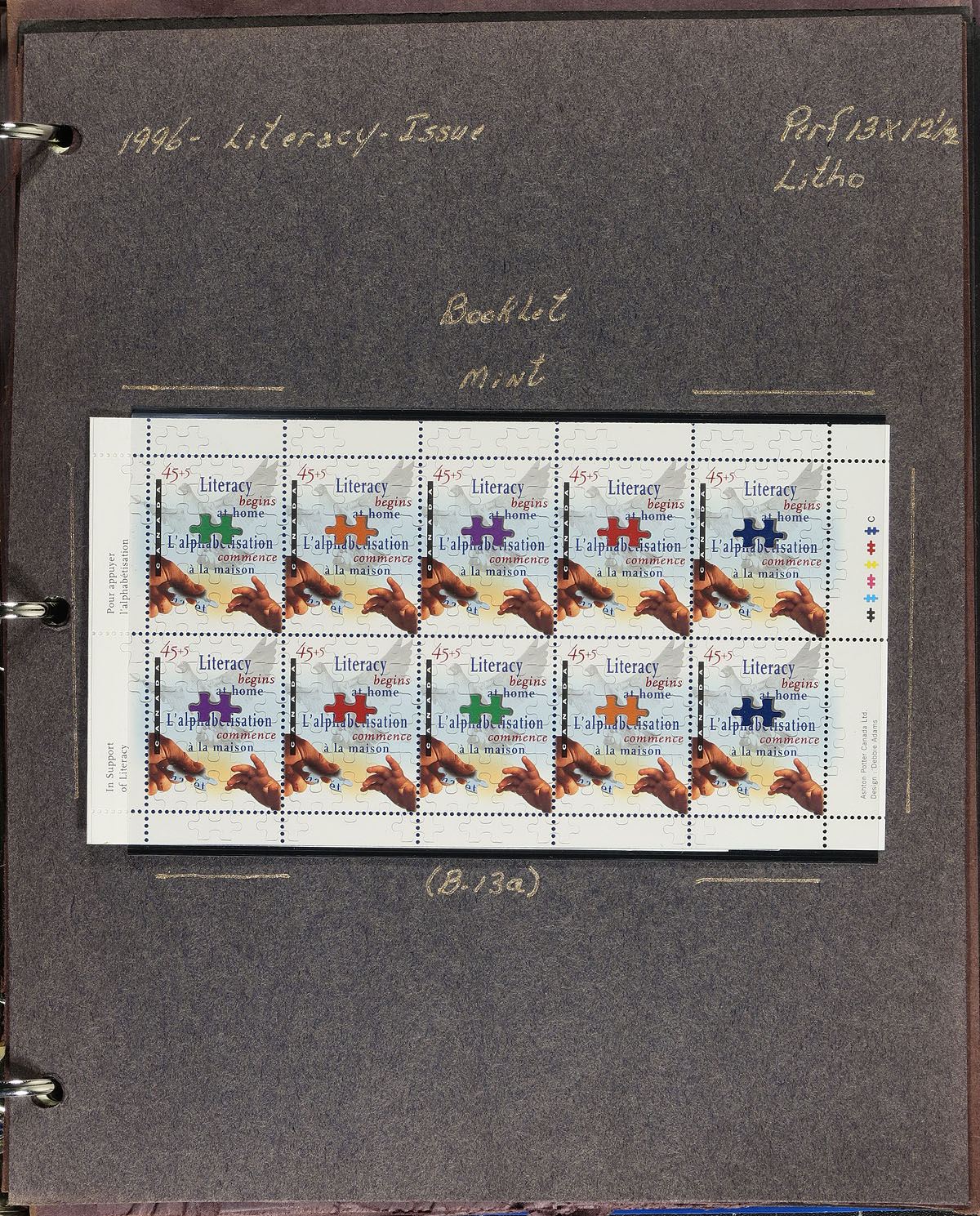 Lovely collection of Canada "Semi-Postal" issues, 1974-2014. covering Unitrade #s B1-B6, B13-B16, B19-B21, all in hingeless mounts on roughly 50 pages housed in a binder. The collection primarily contains mint and used singles, plate blocks, booklets. part panes, and several first day covers (many having lower mainland B.C. postmarks). We note a few items cataloguing $15 and up. Face value alone totals $198.00 (including 127x "P" stamps). A nice collection of these back of the book issues. 2024 Unitrade =