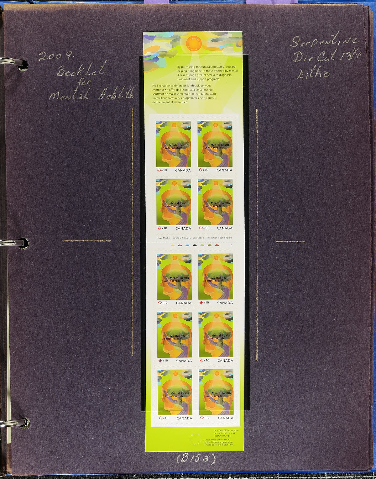 Lovely collection of Canada "Semi-Postal" issues, 1974-2014. covering Unitrade #s B1-B6, B13-B16, B19-B21, all in hingeless mounts on roughly 50 pages housed in a binder. The collection primarily contains mint and used singles, plate blocks, booklets. part panes, and several first day covers (many having lower mainland B.C. postmarks). We note a few items cataloguing $15 and up. Face value alone totals $198.00 (including 127x "P" stamps). A nice collection of these back of the book issues. 2024 Unitrade =
