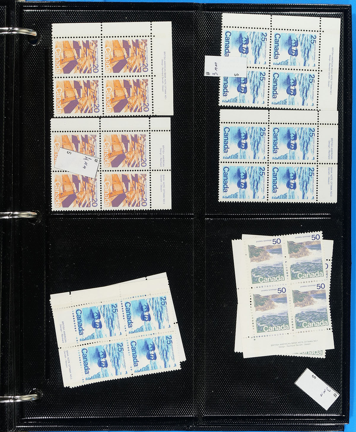 Large collection / accumulation of mint never hinged "Definitive" issues, 1970's-1990's, containing many hundreds of plate blocks, along with a few sheets, coils and multiples, in roughly 50 Vario-style stock pages housed in a binder. We note better representation from Caricature and Landscapes, Flower, Artifacts, and Fruit Trees issues. We note several items cataloguing $10 and up. Face value totals $721.00, with many denominations ranging from 30c up to $2. Unchecked for varieties, paper types, tagging, etc. Ideal for collectors and postage users alike. Conservatively valued for the usable postage value only. Total face value =