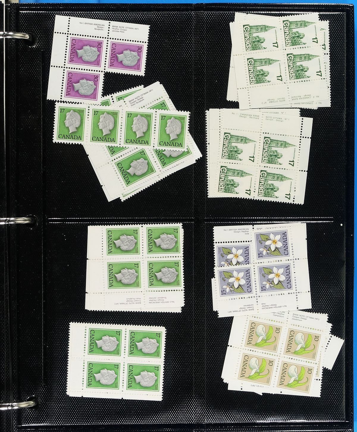 Large collection / accumulation of mint never hinged "Definitive" issues, 1970's-1990's, containing many hundreds of plate blocks, along with a few sheets, coils and multiples, in roughly 50 Vario-style stock pages housed in a binder. We note better representation from Caricature and Landscapes, Flower, Artifacts, and Fruit Trees issues. We note several items cataloguing $10 and up. Face value totals $721.00, with many denominations ranging from 30c up to $2. Unchecked for varieties, paper types, tagging, etc. Ideal for collectors and postage users alike. Conservatively valued for the usable postage value only. Total face value =