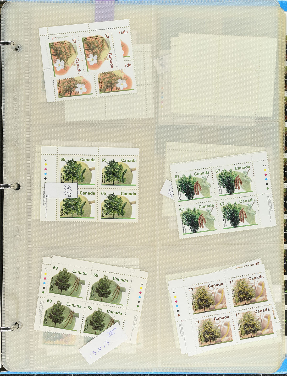 Large collection / accumulation of mint never hinged "Definitive" issues, 1970's-1990's, containing many hundreds of plate blocks, along with a few sheets, coils and multiples, in roughly 50 Vario-style stock pages housed in a binder. We note better representation from Caricature and Landscapes, Flower, Artifacts, and Fruit Trees issues. We note several items cataloguing $10 and up. Face value totals $721.00, with many denominations ranging from 30c up to $2. Unchecked for varieties, paper types, tagging, etc. Ideal for collectors and postage users alike. Conservatively valued for the usable postage value only. Total face value =