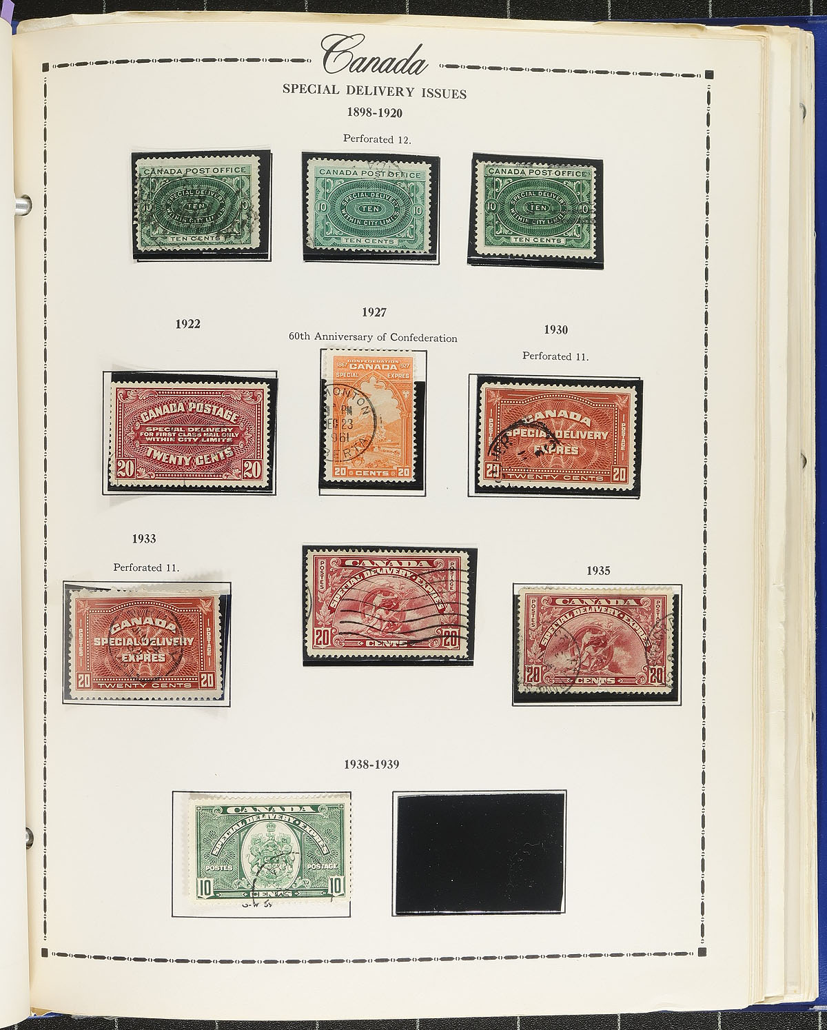 Terrific large collection / accumulation of primarily used Canada in a variety of formats filling a box. The main collection contains several hundreds of stamps in The Heritage Canadian Stamp Album, with material ranging from the Small Queens to 1980's, noting 40 used Small Queens (including 20c and 50c Widow Weeds), Jubilees 1c to 5c, partial sets of Leafs, Numerals, Edwards, Quebecs, Admirals, with full sets of Scrolls, Pictorials, War, and Peace issues. along with Airmails, Special Delivery, and more. The lot continues with a 32 page stockbook containing many hundreds of mint plate blocks (1950's-1960's), a 16 page stockbook containing an accumulation of high denomination used issues from the 1950's-1970's, and used accumulations of thousands of used stamps from the 1950's up to 2000 (noting postmarks from western provinces). The lot also includes a 2019 Unitrade catalogue, supplies, and roughly 500 slogan cancels (cut down from envelopes). A nice opportunity for Canada and postmark collectors, as we note many items cataloguing $5 to $15 and up. Our online photos show a sampling and an overview. Estimate =