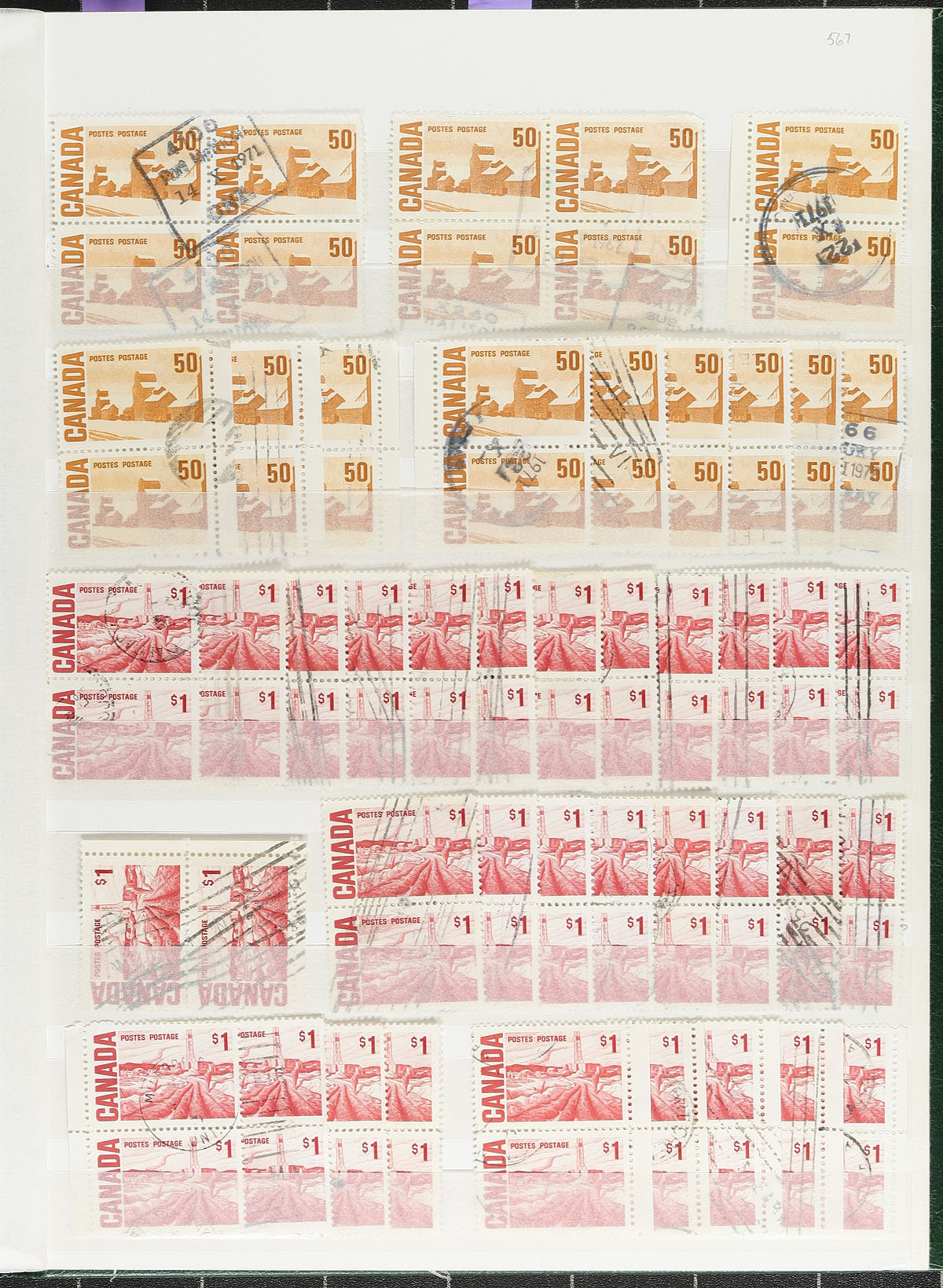 Terrific large collection / accumulation of primarily used Canada in a variety of formats filling a box. The main collection contains several hundreds of stamps in The Heritage Canadian Stamp Album, with material ranging from the Small Queens to 1980's, noting 40 used Small Queens (including 20c and 50c Widow Weeds), Jubilees 1c to 5c, partial sets of Leafs, Numerals, Edwards, Quebecs, Admirals, with full sets of Scrolls, Pictorials, War, and Peace issues. along with Airmails, Special Delivery, and more. The lot continues with a 32 page stockbook containing many hundreds of mint plate blocks (1950's-1960's), a 16 page stockbook containing an accumulation of high denomination used issues from the 1950's-1970's, and used accumulations of thousands of used stamps from the 1950's up to 2000 (noting postmarks from western provinces). The lot also includes a 2019 Unitrade catalogue, supplies, and roughly 500 slogan cancels (cut down from envelopes). A nice opportunity for Canada and postmark collectors, as we note many items cataloguing $5 to $15 and up. Our online photos show a sampling and an overview. Estimate =