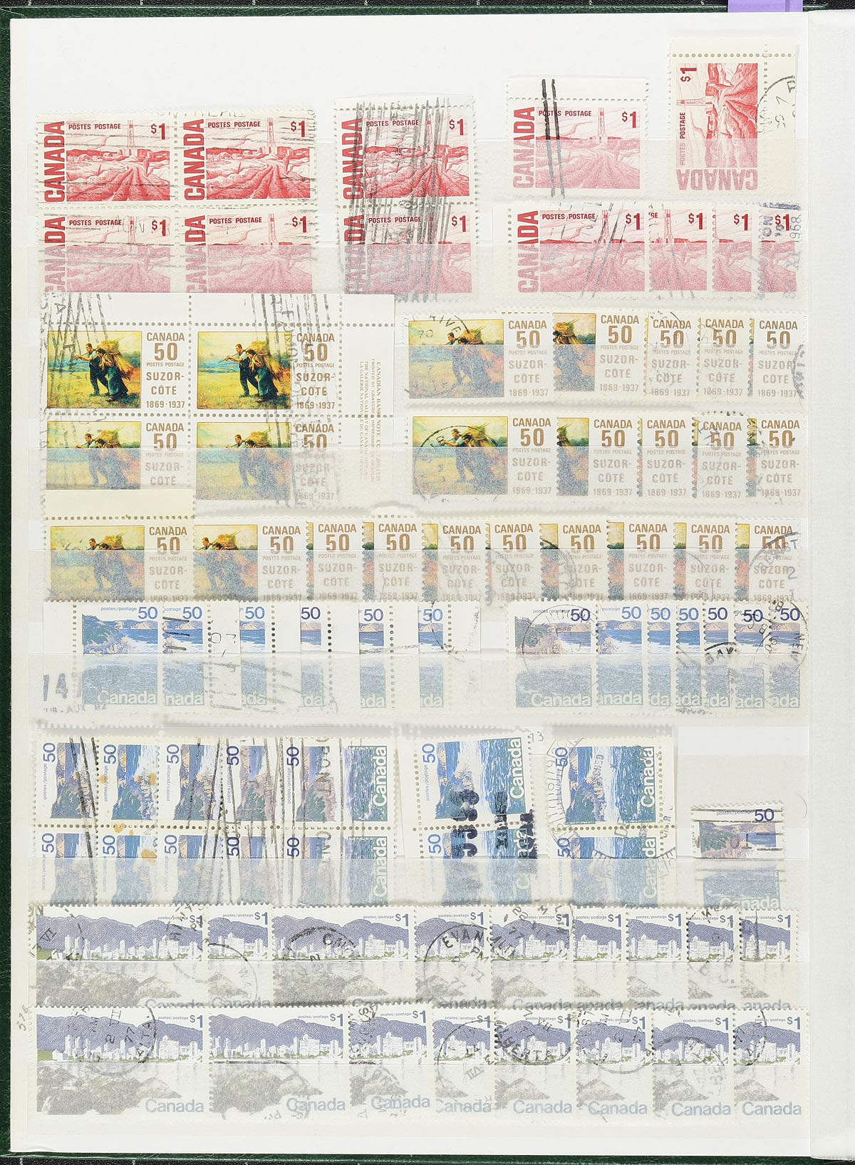 Terrific large collection / accumulation of primarily used Canada in a variety of formats filling a box. The main collection contains several hundreds of stamps in The Heritage Canadian Stamp Album, with material ranging from the Small Queens to 1980's, noting 40 used Small Queens (including 20c and 50c Widow Weeds), Jubilees 1c to 5c, partial sets of Leafs, Numerals, Edwards, Quebecs, Admirals, with full sets of Scrolls, Pictorials, War, and Peace issues. along with Airmails, Special Delivery, and more. The lot continues with a 32 page stockbook containing many hundreds of mint plate blocks (1950's-1960's), a 16 page stockbook containing an accumulation of high denomination used issues from the 1950's-1970's, and used accumulations of thousands of used stamps from the 1950's up to 2000 (noting postmarks from western provinces). The lot also includes a 2019 Unitrade catalogue, supplies, and roughly 500 slogan cancels (cut down from envelopes). A nice opportunity for Canada and postmark collectors, as we note many items cataloguing $5 to $15 and up. Our online photos show a sampling and an overview. Estimate =