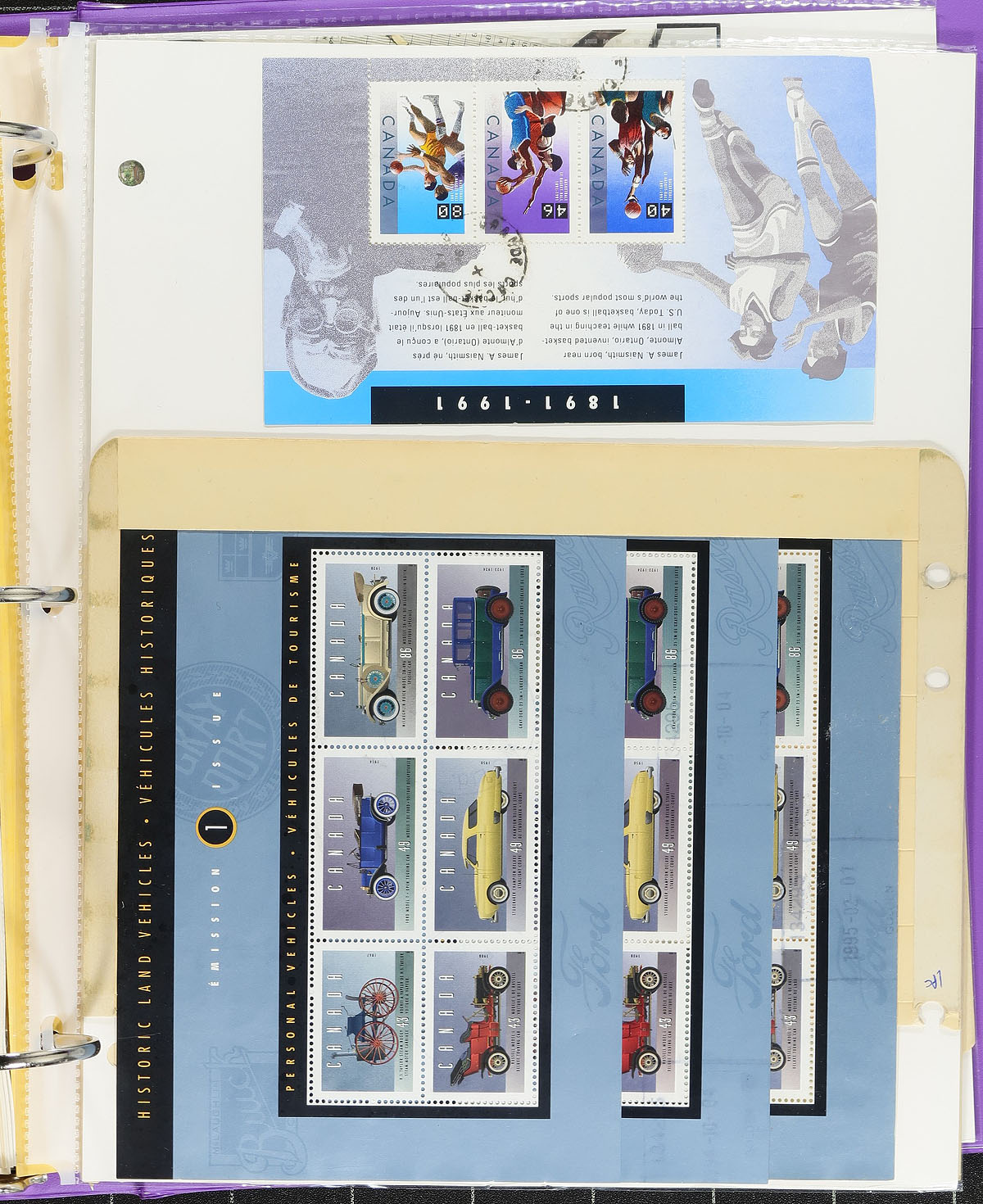 Terrific large collection / accumulation of primarily used Canada in a variety of formats filling a box. The main collection contains several hundreds of stamps in The Heritage Canadian Stamp Album, with material ranging from the Small Queens to 1980's, noting 40 used Small Queens (including 20c and 50c Widow Weeds), Jubilees 1c to 5c, partial sets of Leafs, Numerals, Edwards, Quebecs, Admirals, with full sets of Scrolls, Pictorials, War, and Peace issues. along with Airmails, Special Delivery, and more. The lot continues with a 32 page stockbook containing many hundreds of mint plate blocks (1950's-1960's), a 16 page stockbook containing an accumulation of high denomination used issues from the 1950's-1970's, and used accumulations of thousands of used stamps from the 1950's up to 2000 (noting postmarks from western provinces). The lot also includes a 2019 Unitrade catalogue, supplies, and roughly 500 slogan cancels (cut down from envelopes). A nice opportunity for Canada and postmark collectors, as we note many items cataloguing $5 to $15 and up. Our online photos show a sampling and an overview. Estimate =