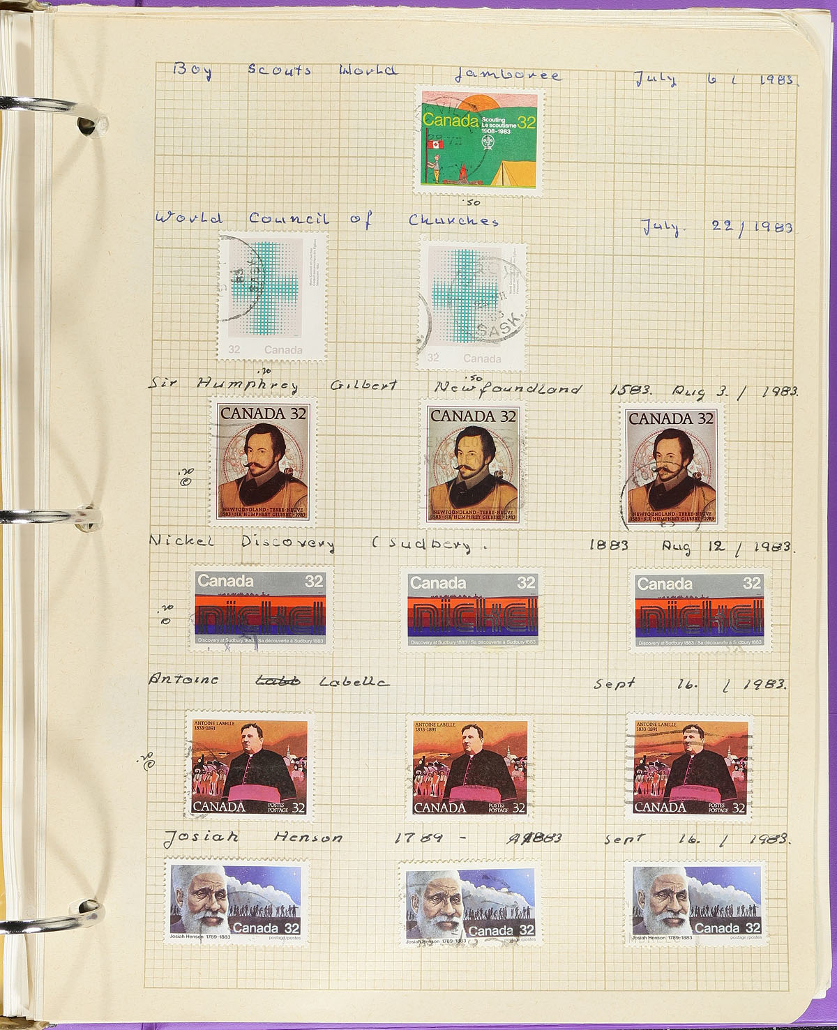 Terrific large collection / accumulation of primarily used Canada in a variety of formats filling a box. The main collection contains several hundreds of stamps in The Heritage Canadian Stamp Album, with material ranging from the Small Queens to 1980's, noting 40 used Small Queens (including 20c and 50c Widow Weeds), Jubilees 1c to 5c, partial sets of Leafs, Numerals, Edwards, Quebecs, Admirals, with full sets of Scrolls, Pictorials, War, and Peace issues. along with Airmails, Special Delivery, and more. The lot continues with a 32 page stockbook containing many hundreds of mint plate blocks (1950's-1960's), a 16 page stockbook containing an accumulation of high denomination used issues from the 1950's-1970's, and used accumulations of thousands of used stamps from the 1950's up to 2000 (noting postmarks from western provinces). The lot also includes a 2019 Unitrade catalogue, supplies, and roughly 500 slogan cancels (cut down from envelopes). A nice opportunity for Canada and postmark collectors, as we note many items cataloguing $5 to $15 and up. Our online photos show a sampling and an overview. Estimate =